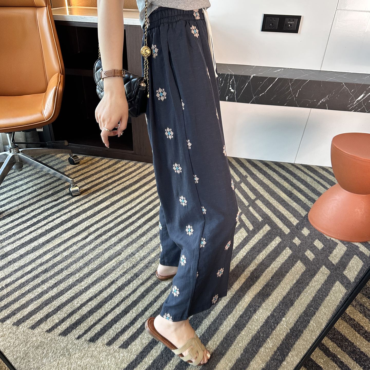 时髦人气王~!松紧腰棉麻刺绣休闲裤女夏季薄款设计感九分阔腿裤