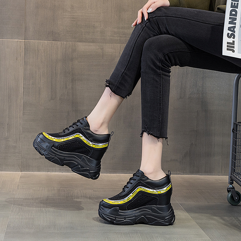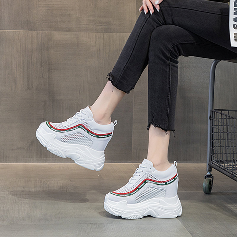 震地王松糕鞋女厚底春款12cm镂空内增高网鞋休闲跑步运动老爹单鞋