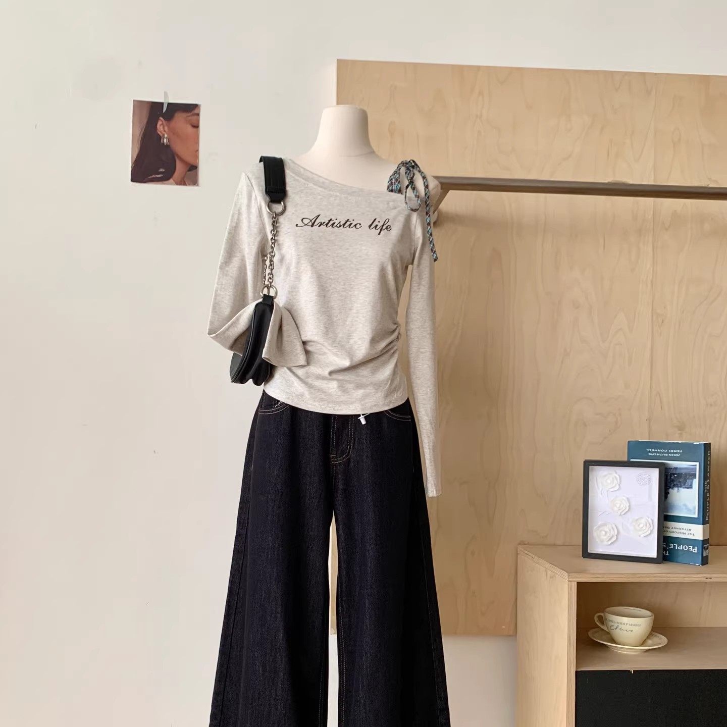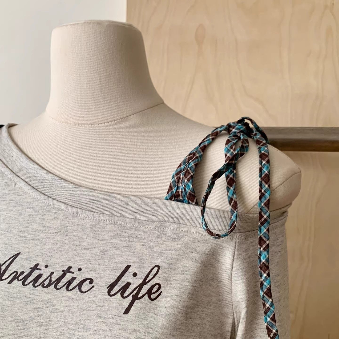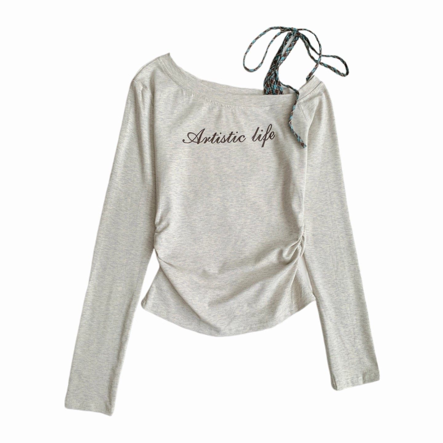 格子绑带斜肩长袖T恤女