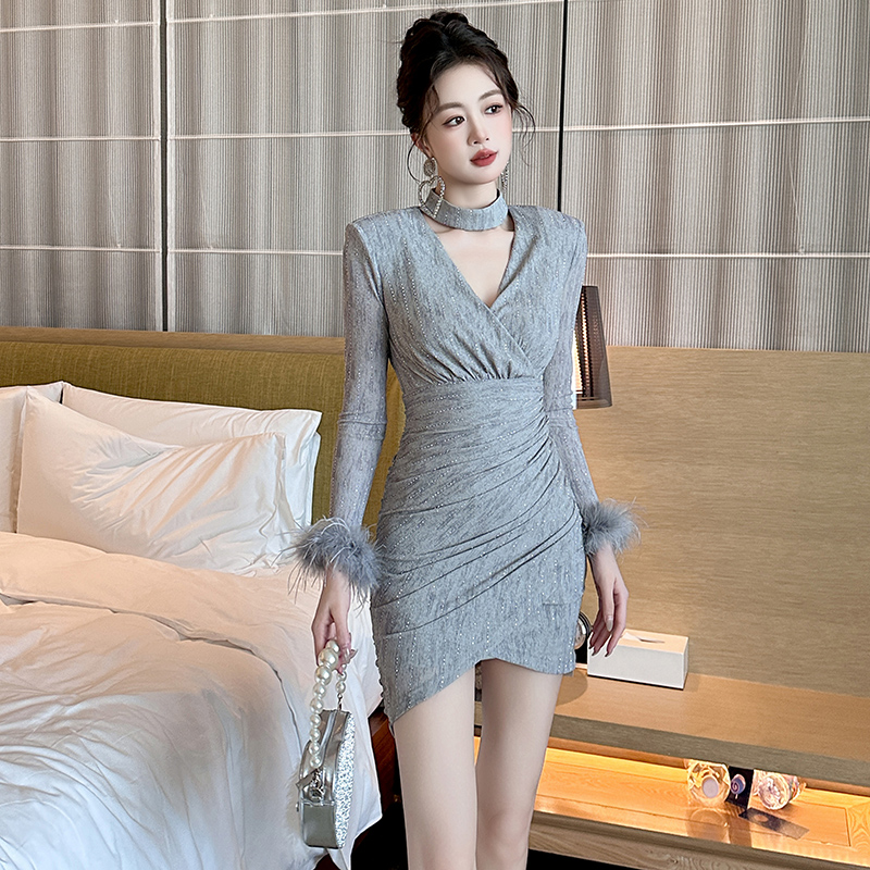 性感深V御姐风长袖包臀连衣裙女显高穿搭小个子针织显瘦修身裙子