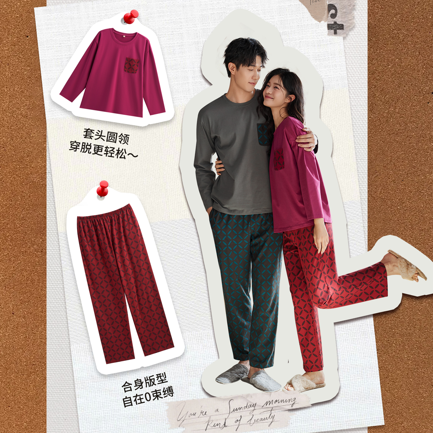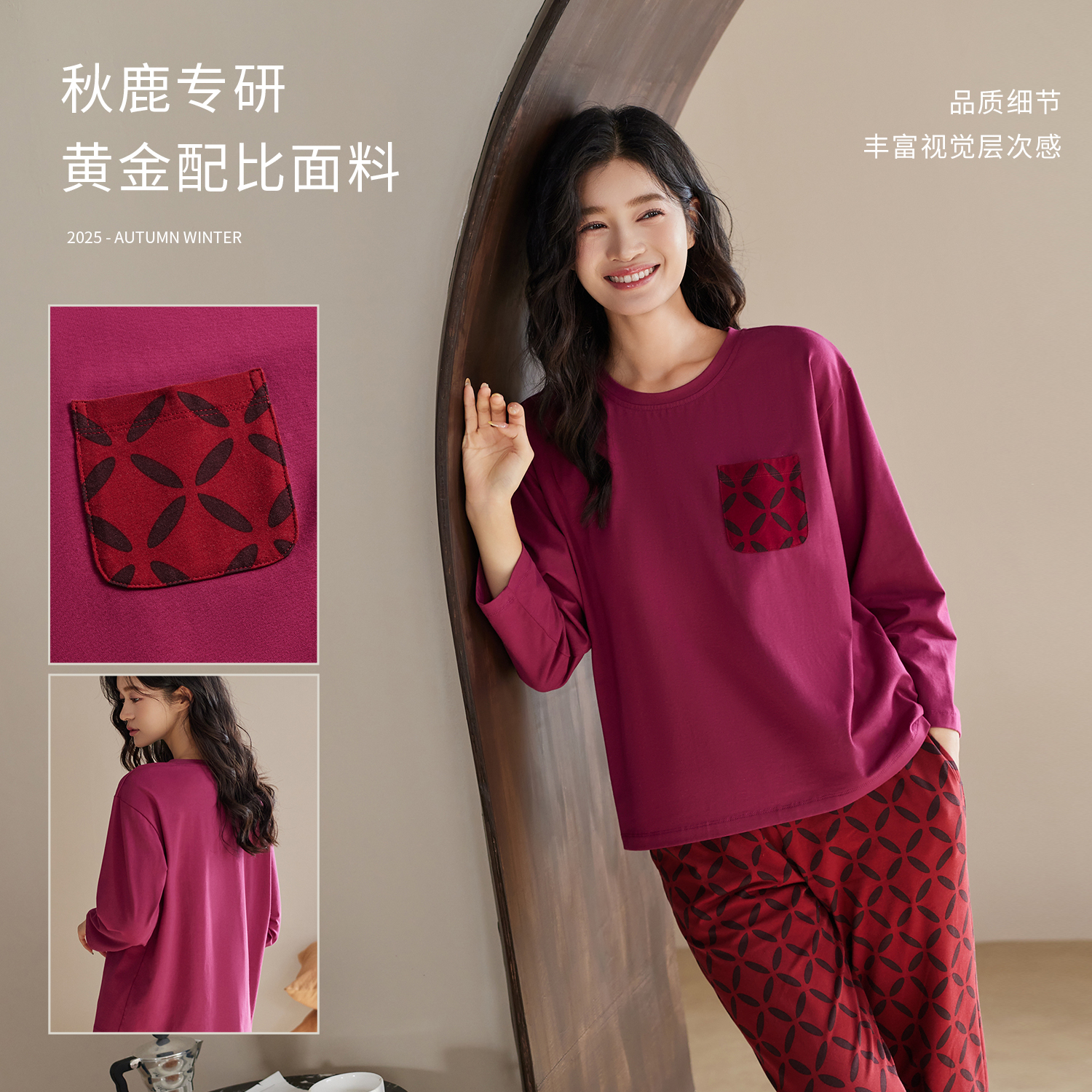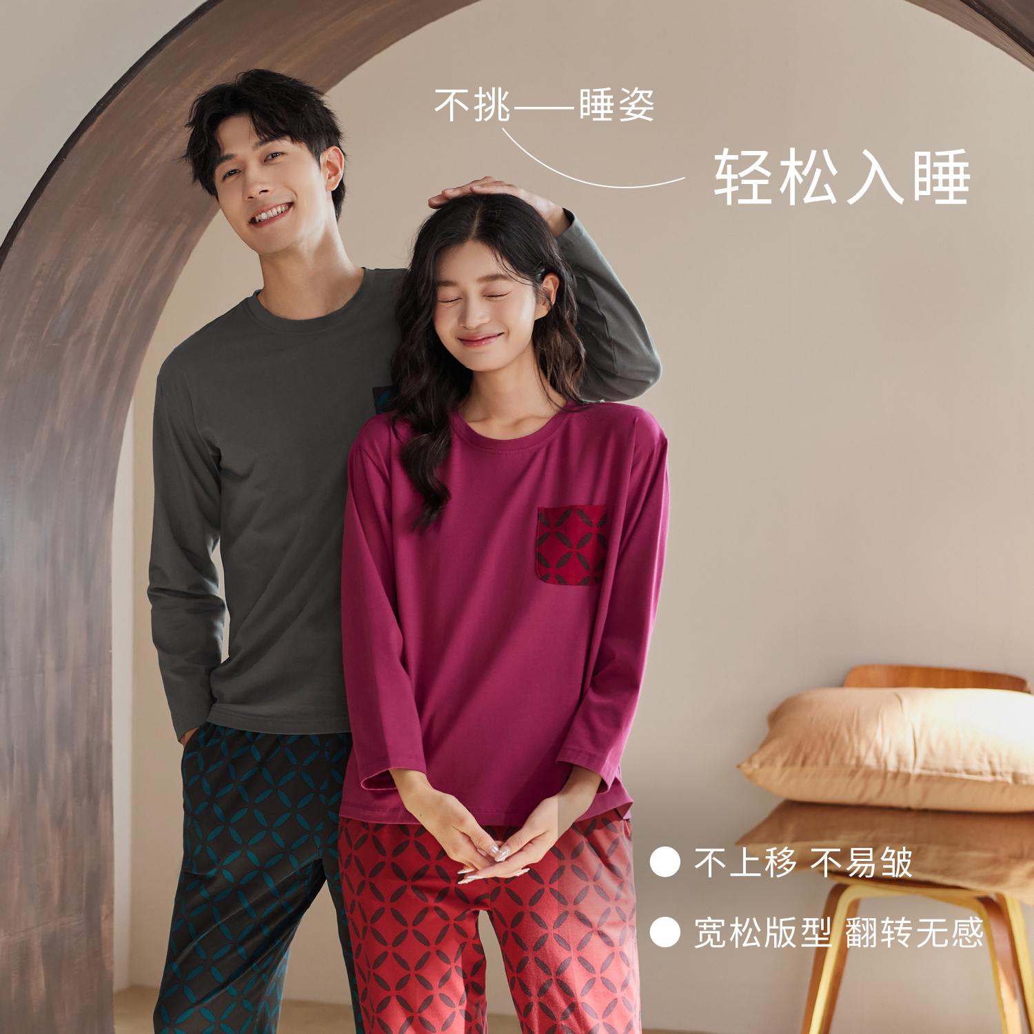 秋鹿情侣睡衣女春秋【5A抑菌】纯棉舒适透气圆领长袖男家居服套装