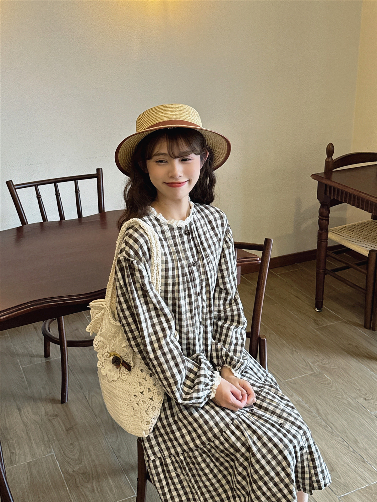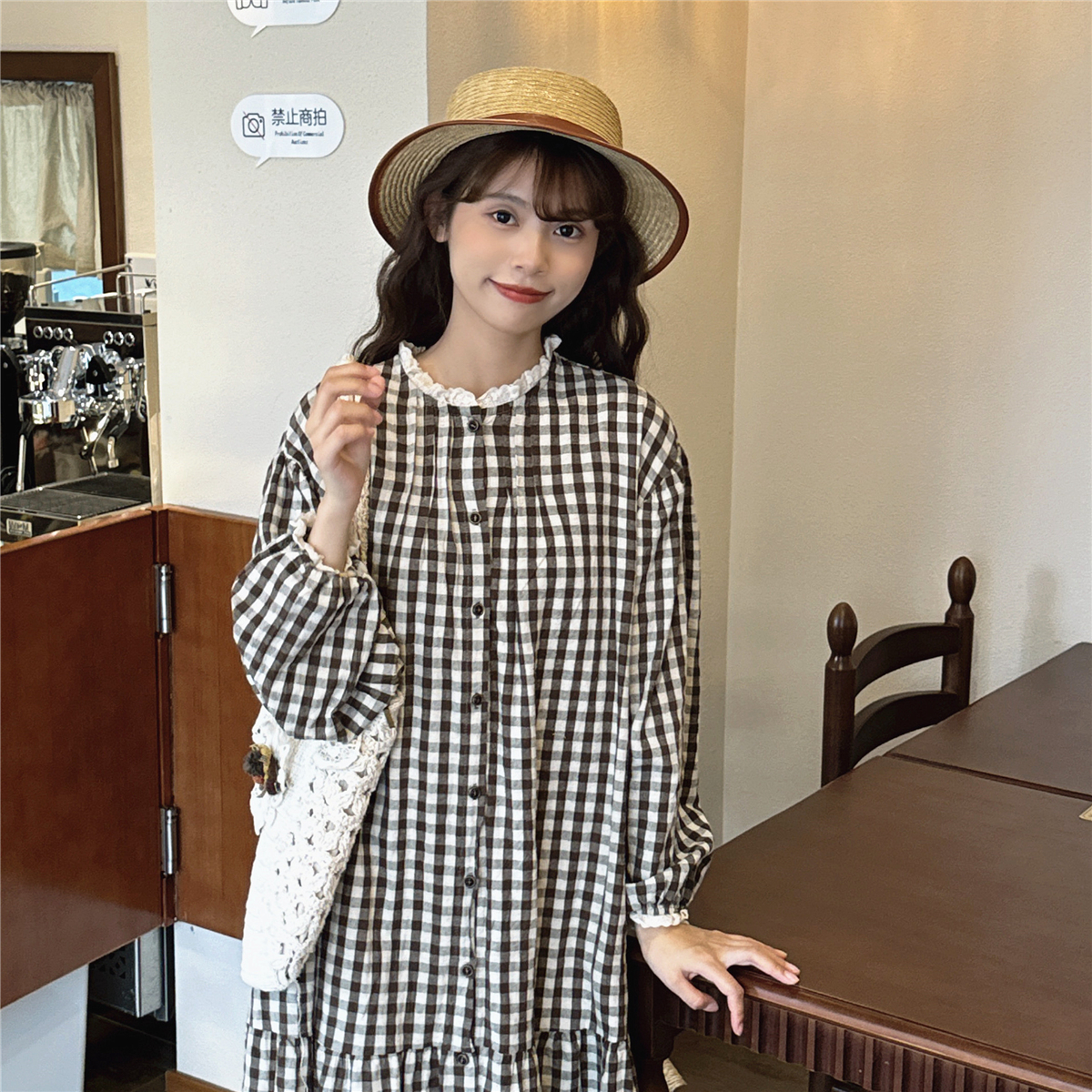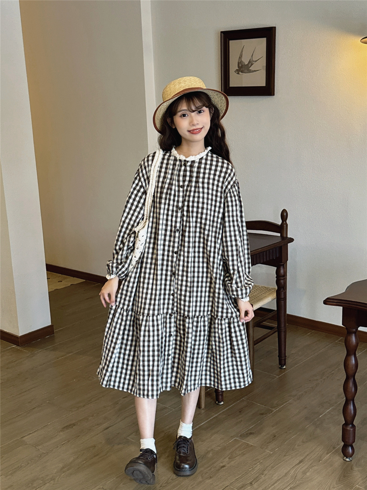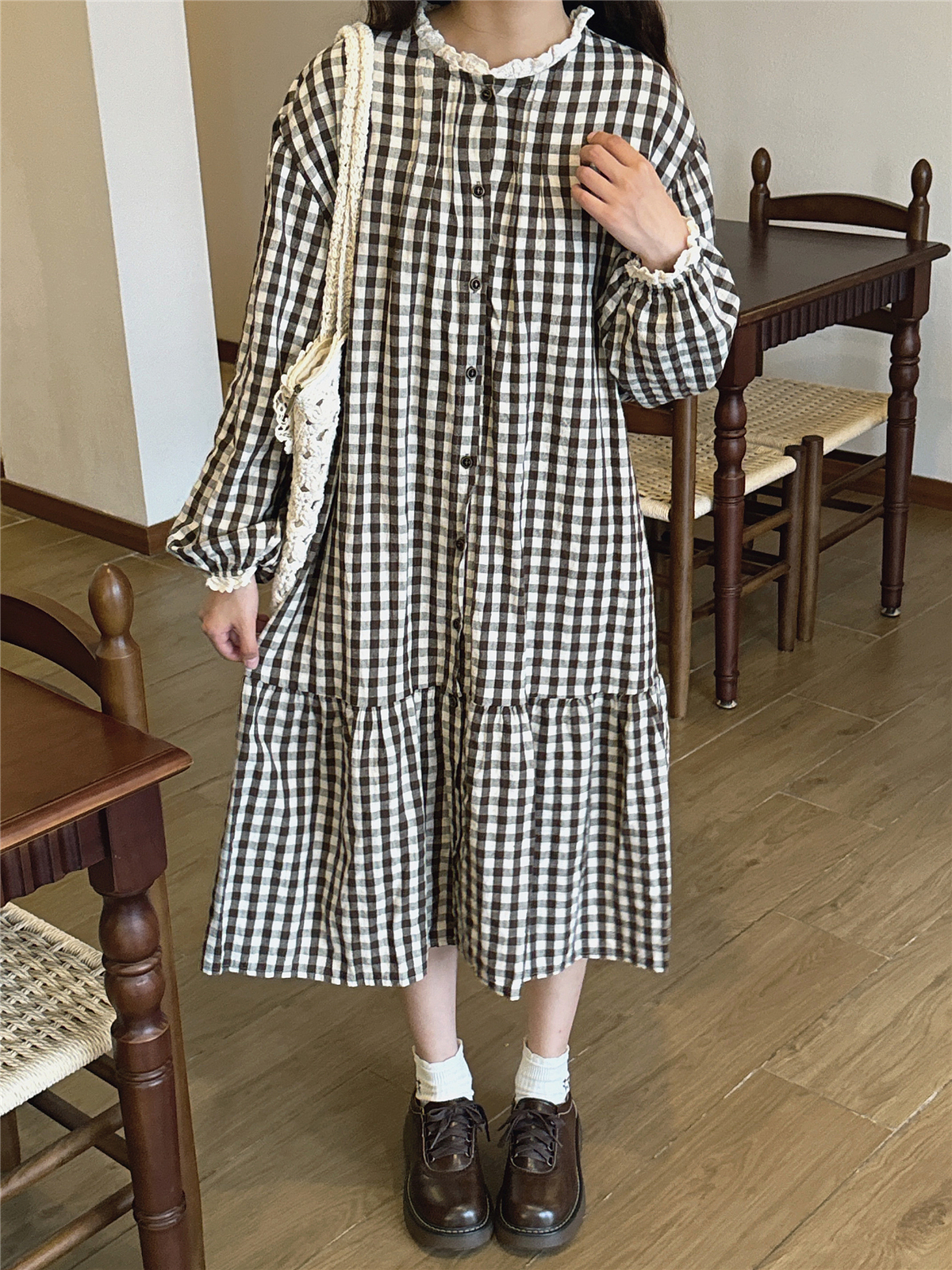 日系文艺咖啡色格子鱼尾裙复古温柔蕾丝花边小立领森系棉麻连衣裙