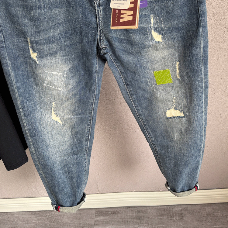 高街潮牌破洞牛仔裤男2025年春个性潮流刮烂补丁裤弹力9分裤子男