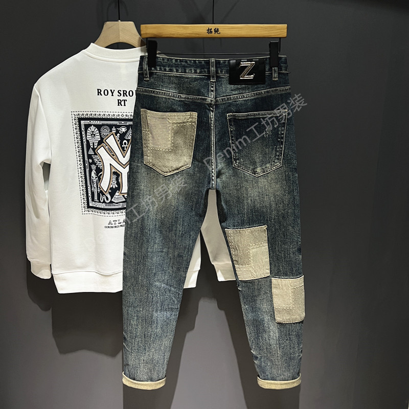 高端潮牌破洞补丁乞丐ins男修身弹力小直筒牛仔长裤2025秋冬新款