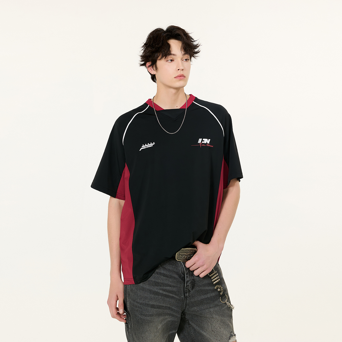 FORNINES夏季凉感速干拼色V领运动短袖T恤男女宽松半袖情侣上衣潮
