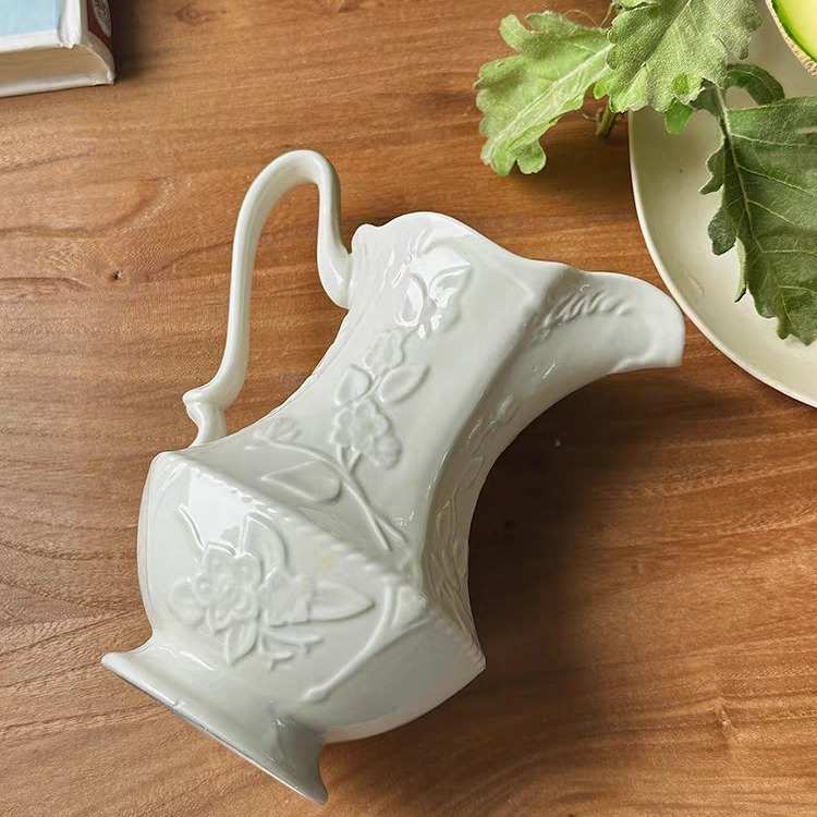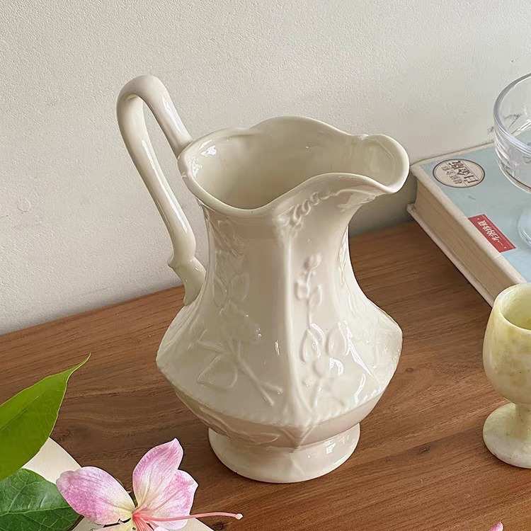 奶油风浮雕陶瓷花瓶 法式浪漫客厅桌面插花 白色单耳奶壶摆件批发