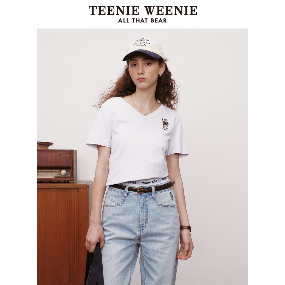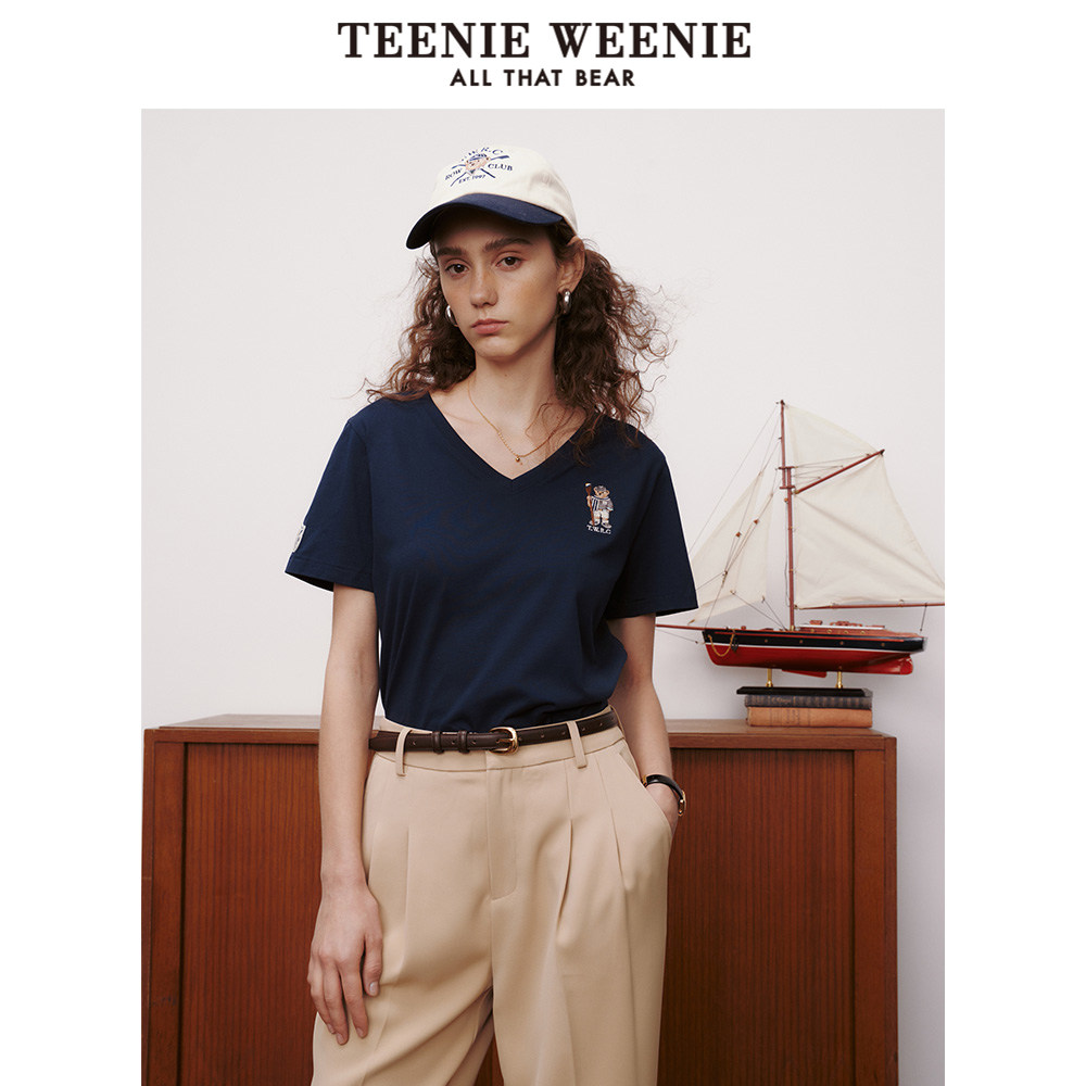 TeenieWeenie小熊奥莱基础款舒适简约V领短袖T恤刺绣休闲上衣女装