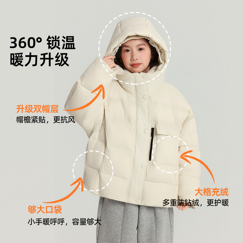 乔伊思童装童连帽短款羽绒服2025冬新款儿童防风大口袋白鸭绒外套