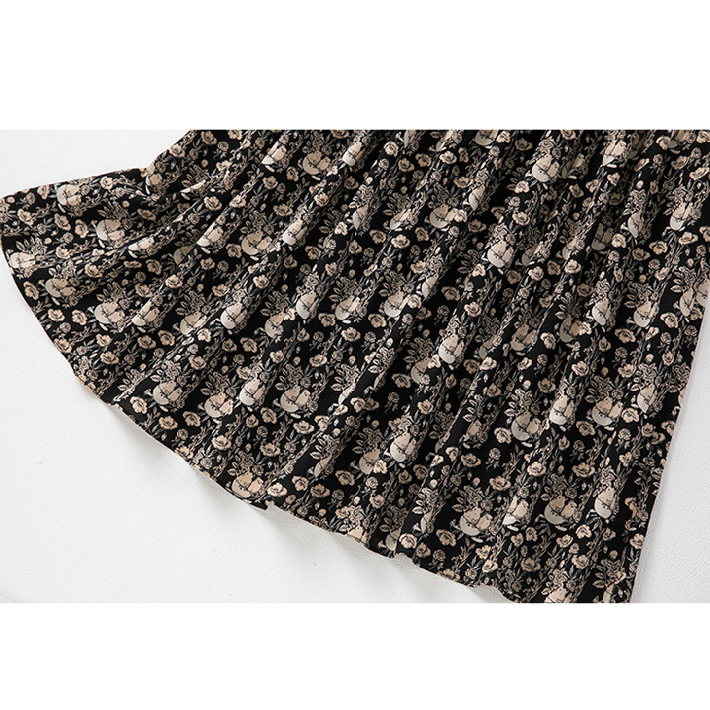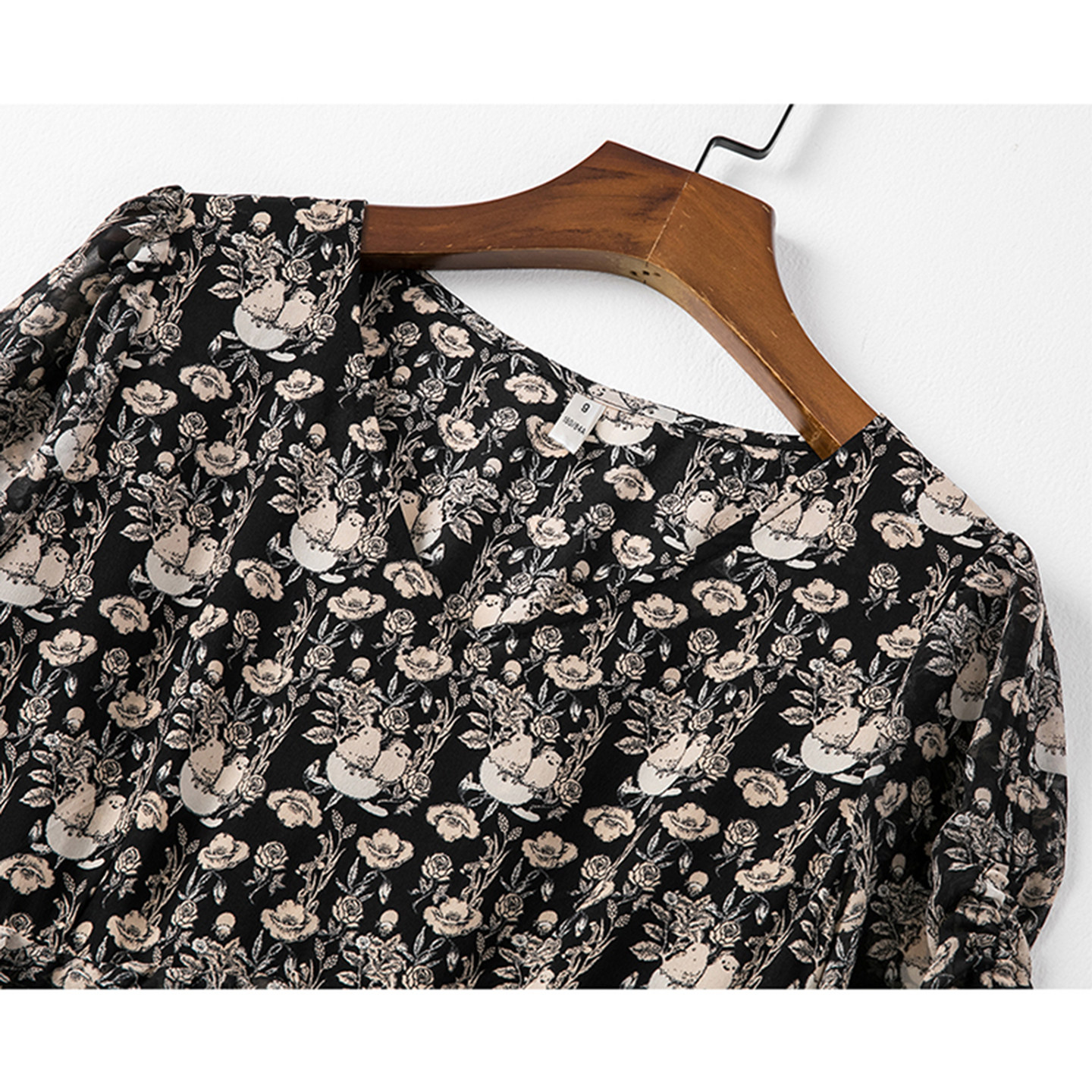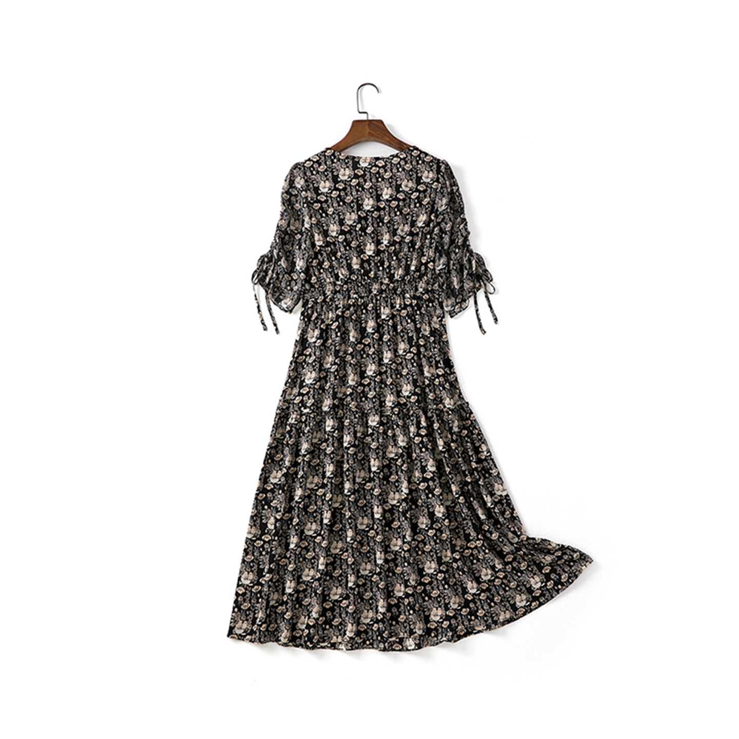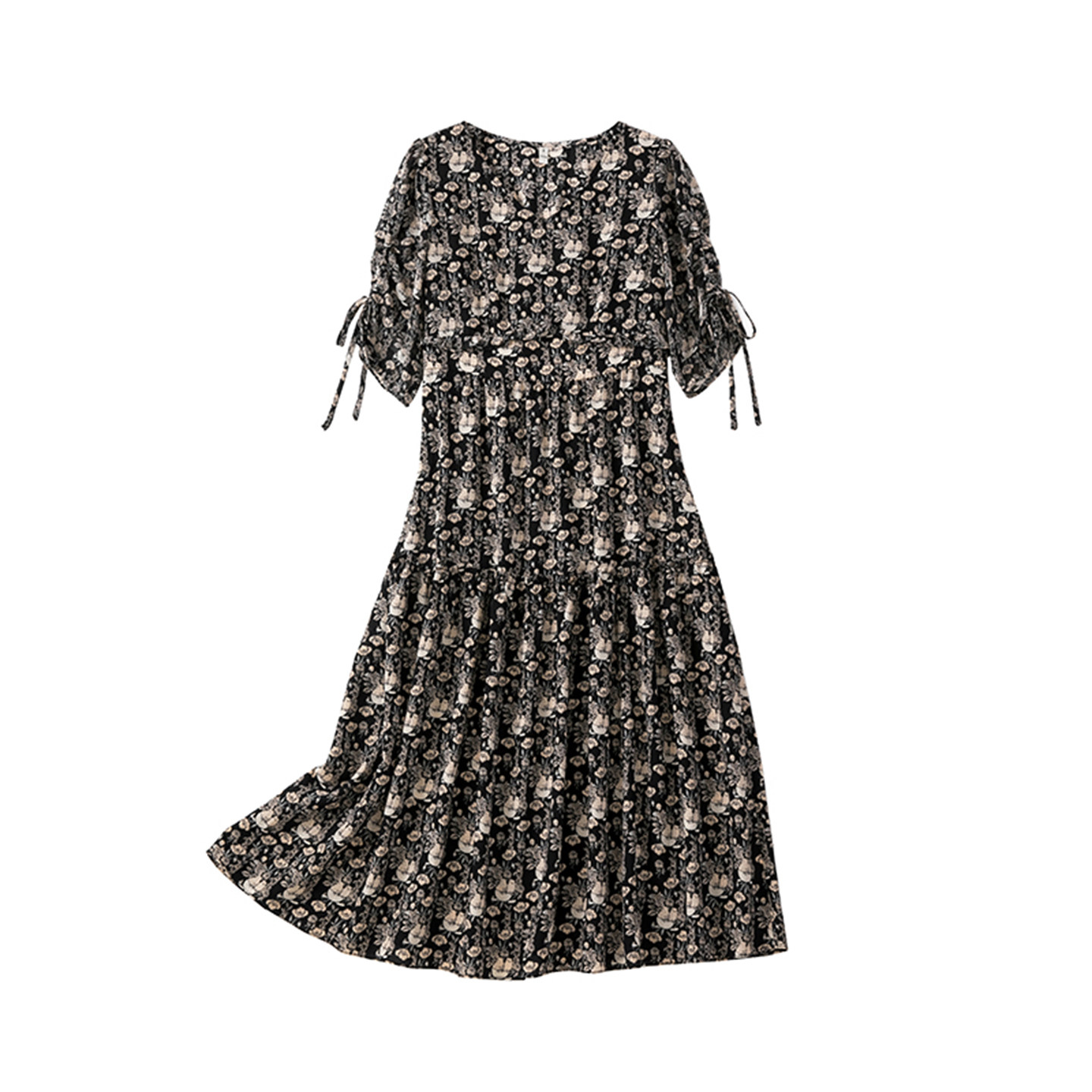 紫米衣坊印花中袖雪纺连衣裙女小个子新款中年裙子碎花高腰长裙
