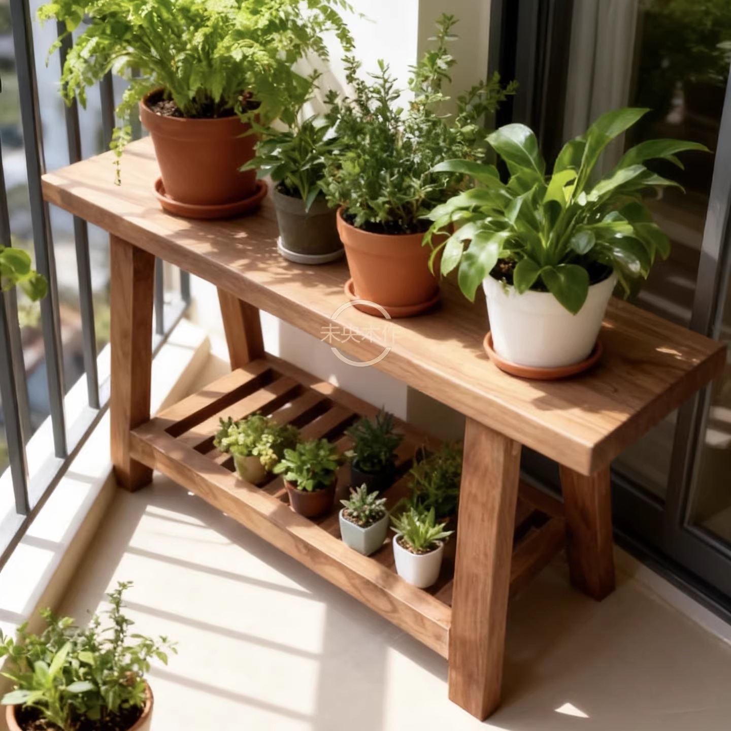 家用实木双层花架阳台收纳加厚置物架花房木架长条板凳简约花盆架