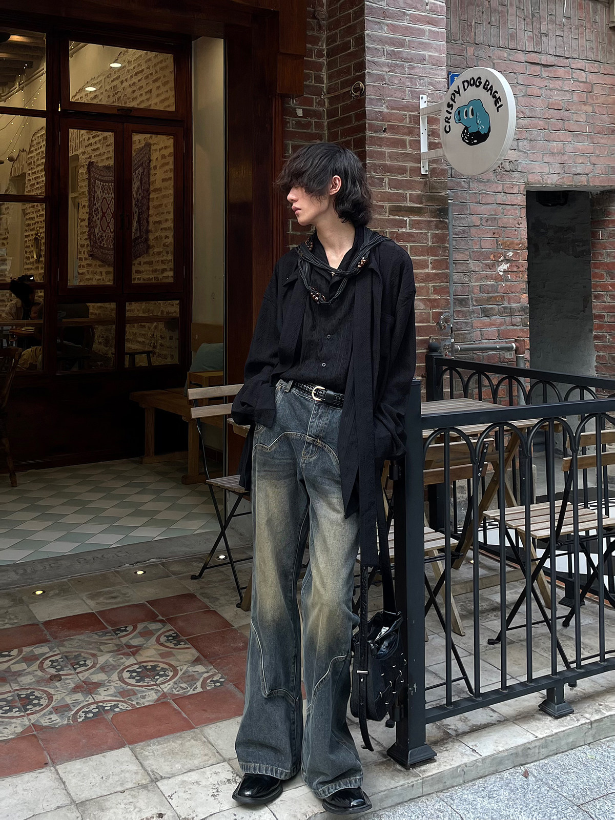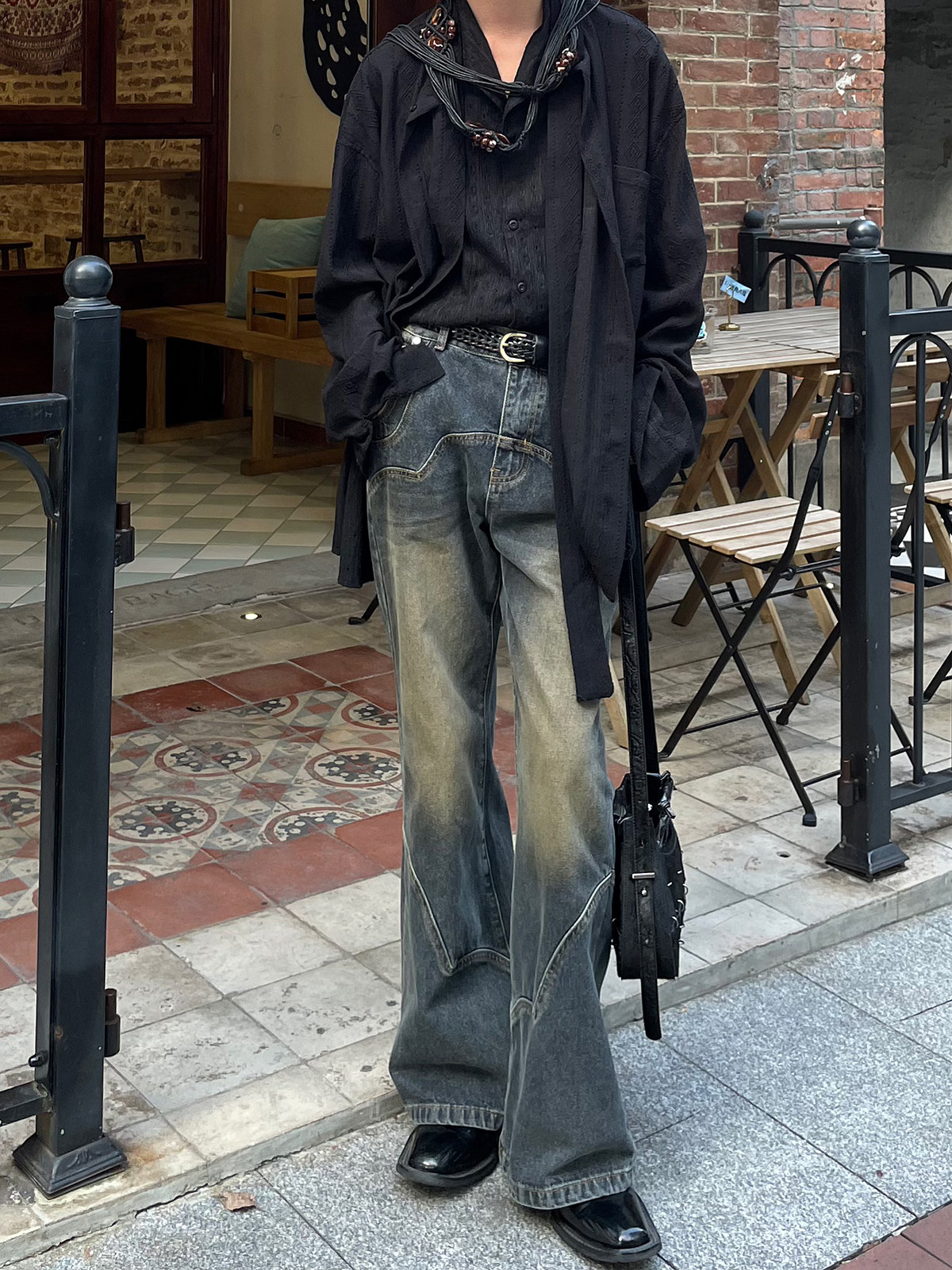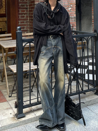 以休眠 经典复古小众结构设计怀旧水洗做旧微喇叭牛仔裤长裤