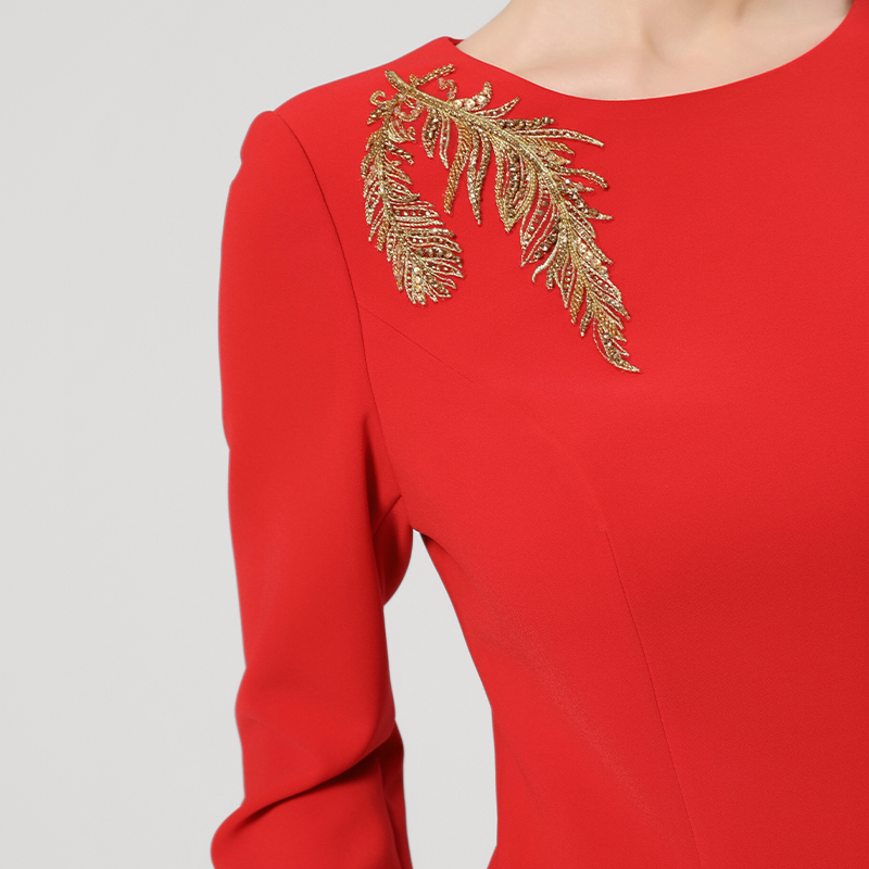 阿丹娜女装秋冬新款红色刺绣钉珠连衣裙子圆领修身礼服裙官方正品