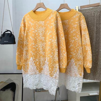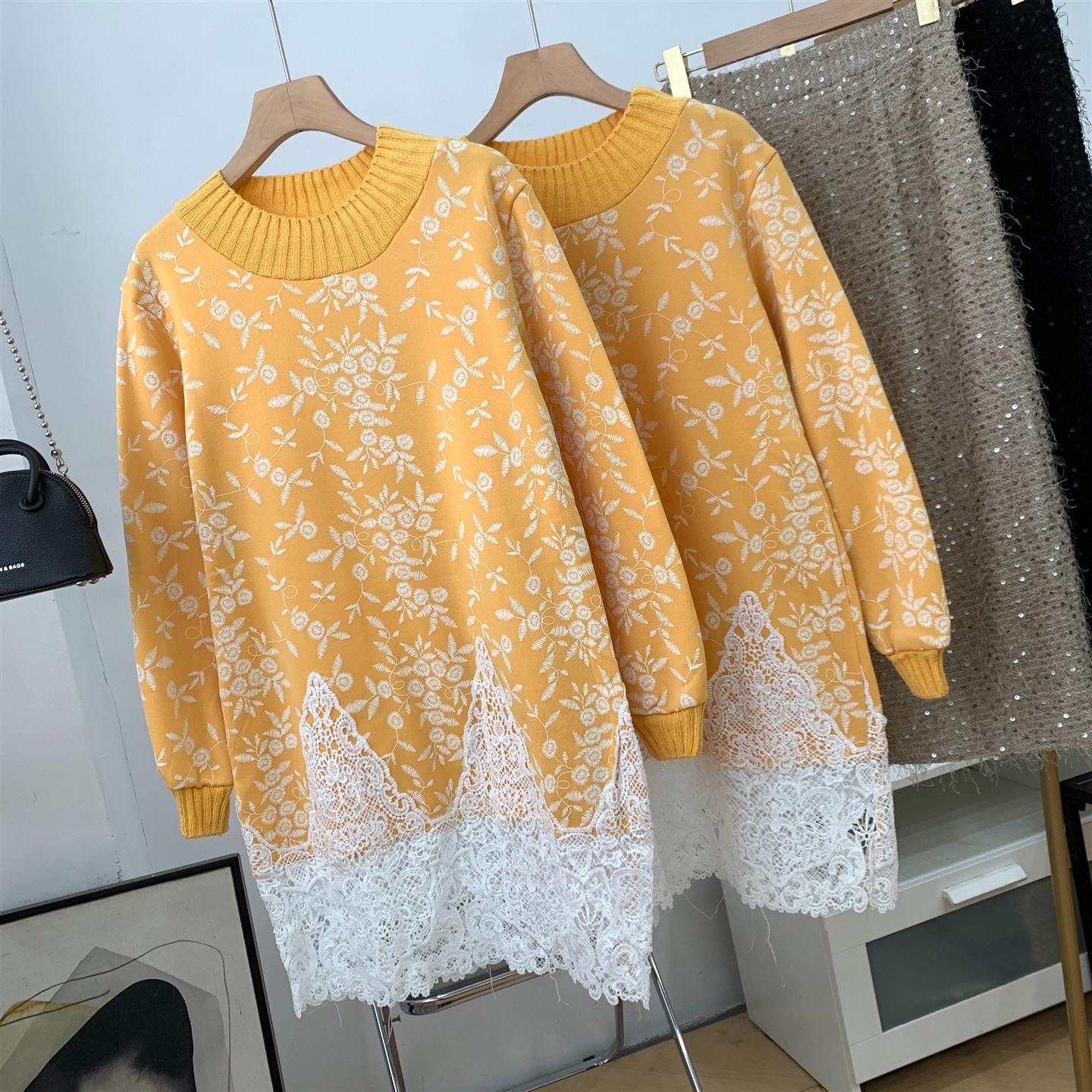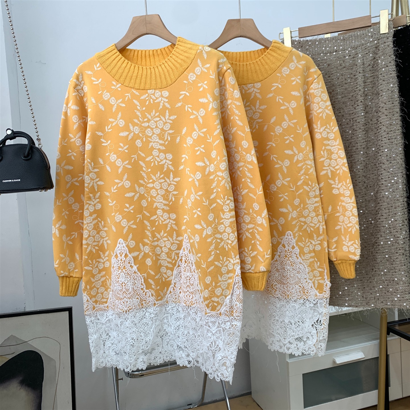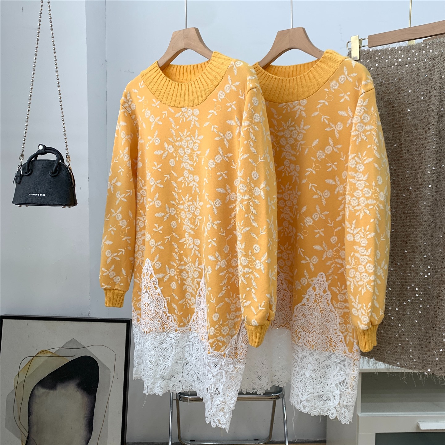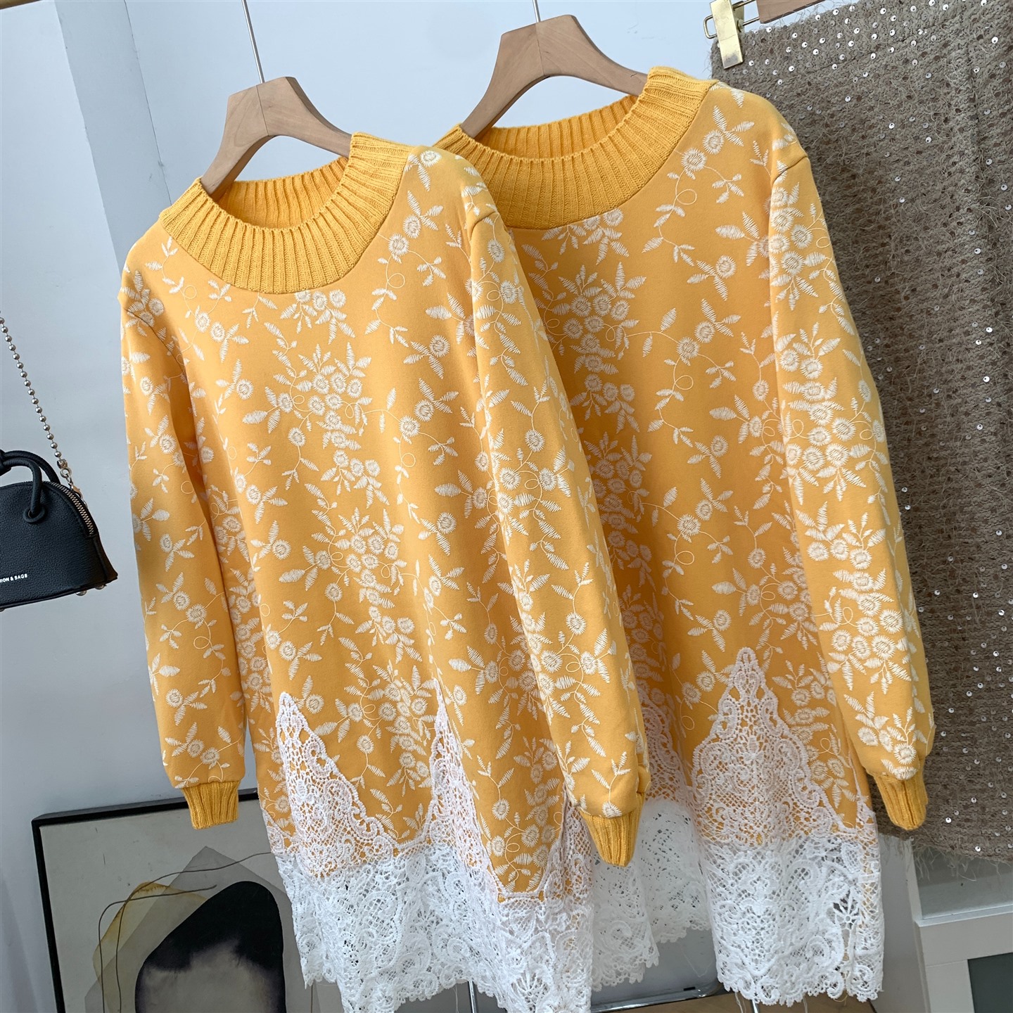 连衣裙秋季新款假两件套头圆领长袖拼接蕾丝边小众设计J#7