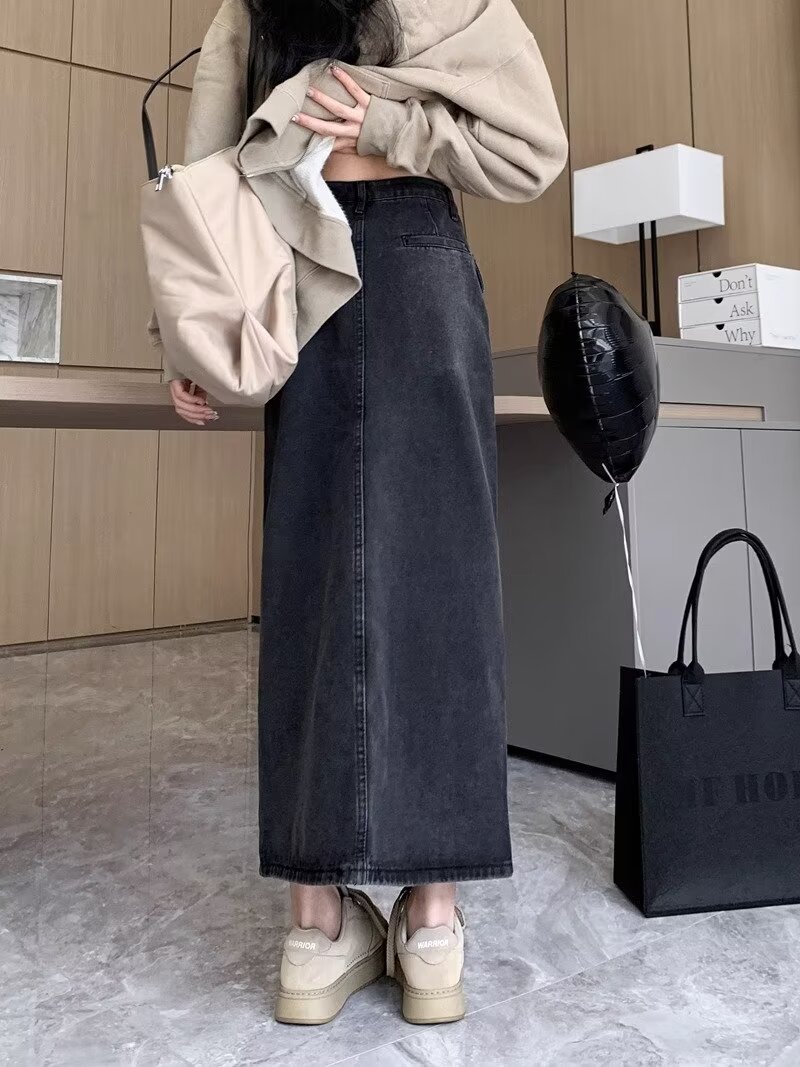 复古风高腰牛仔半身裙女中长款开叉长裙包臀裙黑灰色显瘦a字裙子