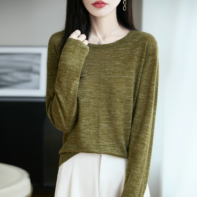 2025秋新款彩麻薄款圆领针织毛衣女短款套头宽松显瘦亚麻打底上衣