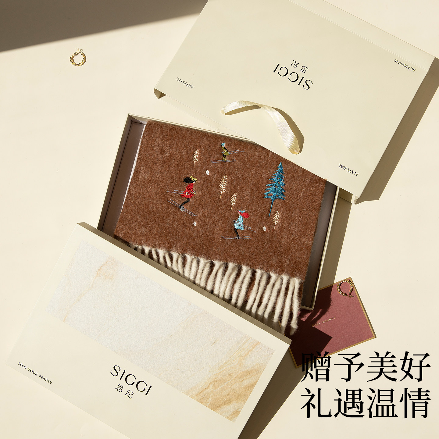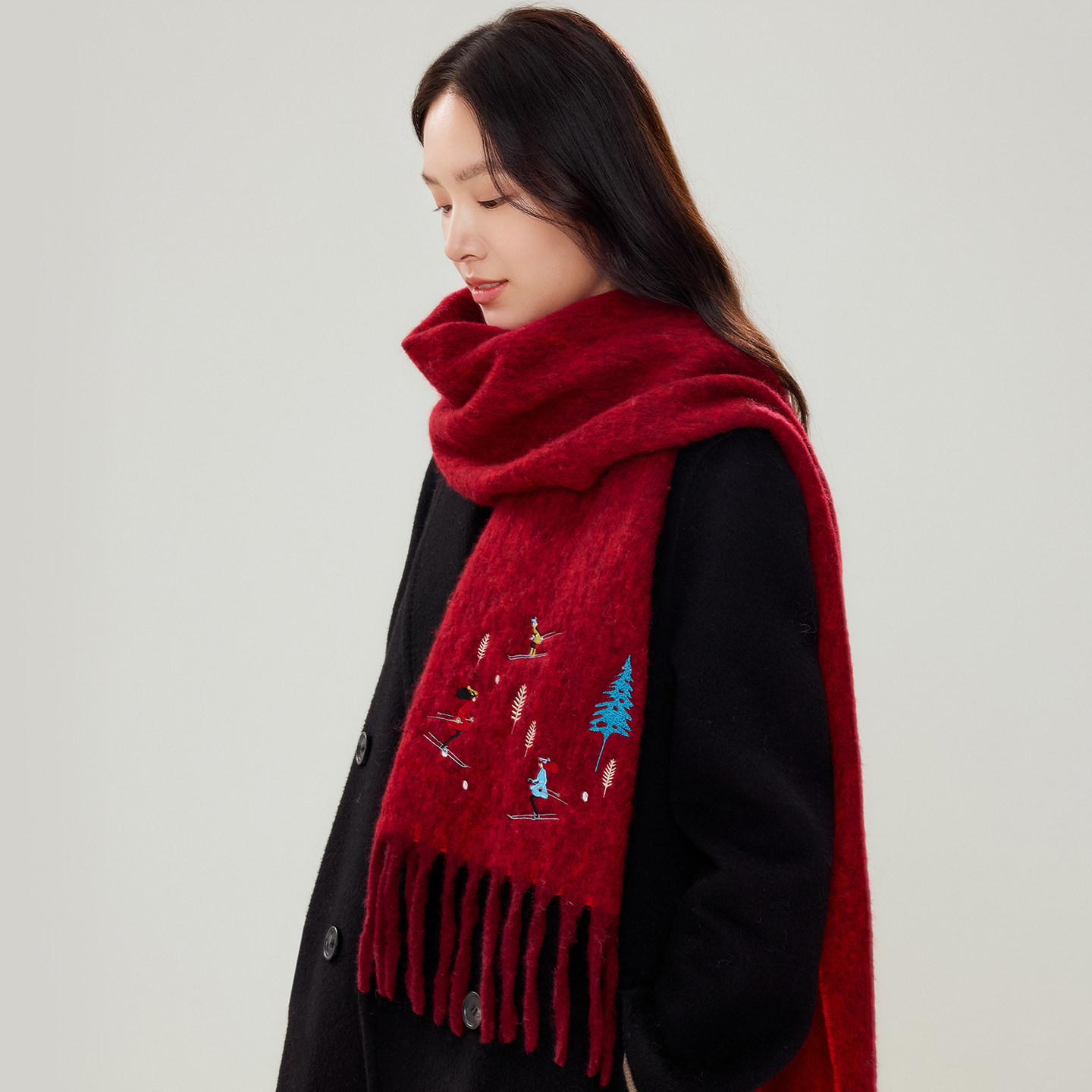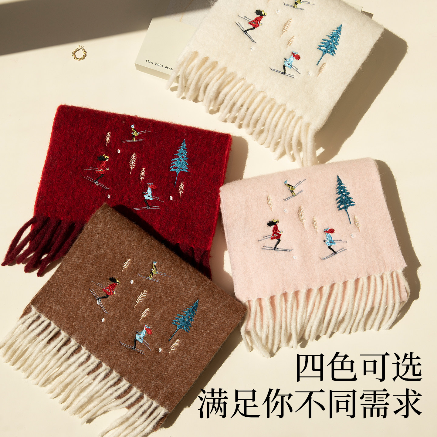 siggi 设计师滑雪女孩羊毛围巾冬季女刺绣送女友生日礼物圣诞围脖