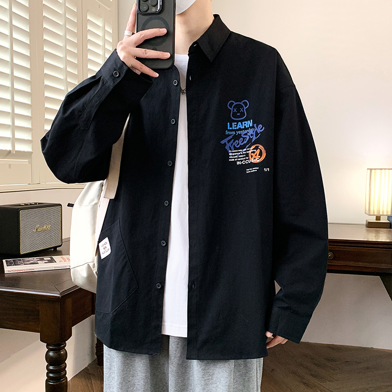 纯棉长袖衬衫男生春秋季潮牌衬衣青少年初中高中学生潮流休闲外套
