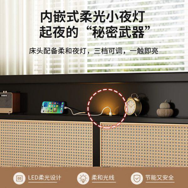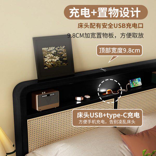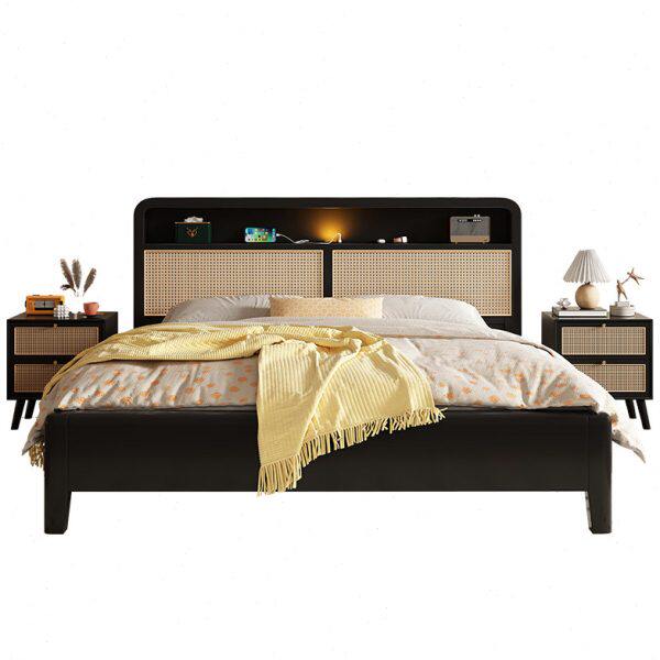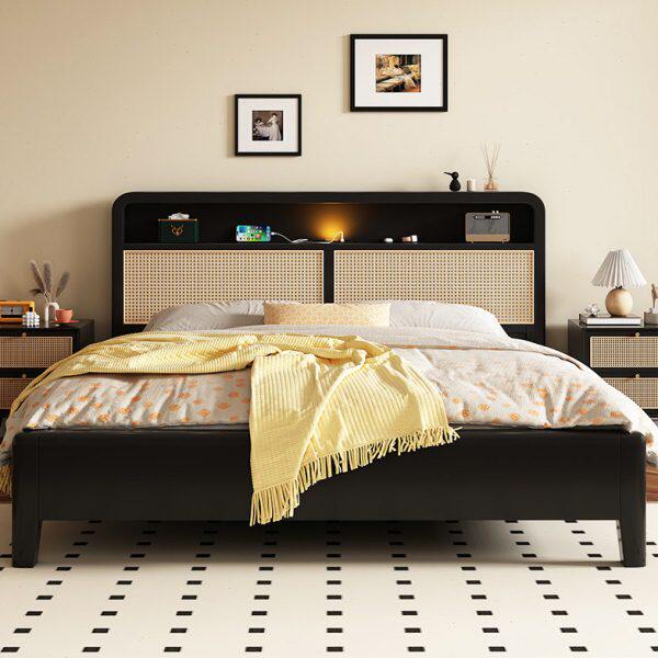 北欧复古实木藤编床主卧1.8m双人床法式黑色侘寂风床中古风储物床