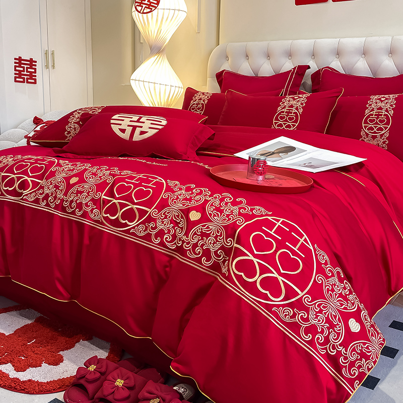 高级感纯棉婚庆四件套红色结婚刺绣被套床单婚礼喜被床上用品婚嫁