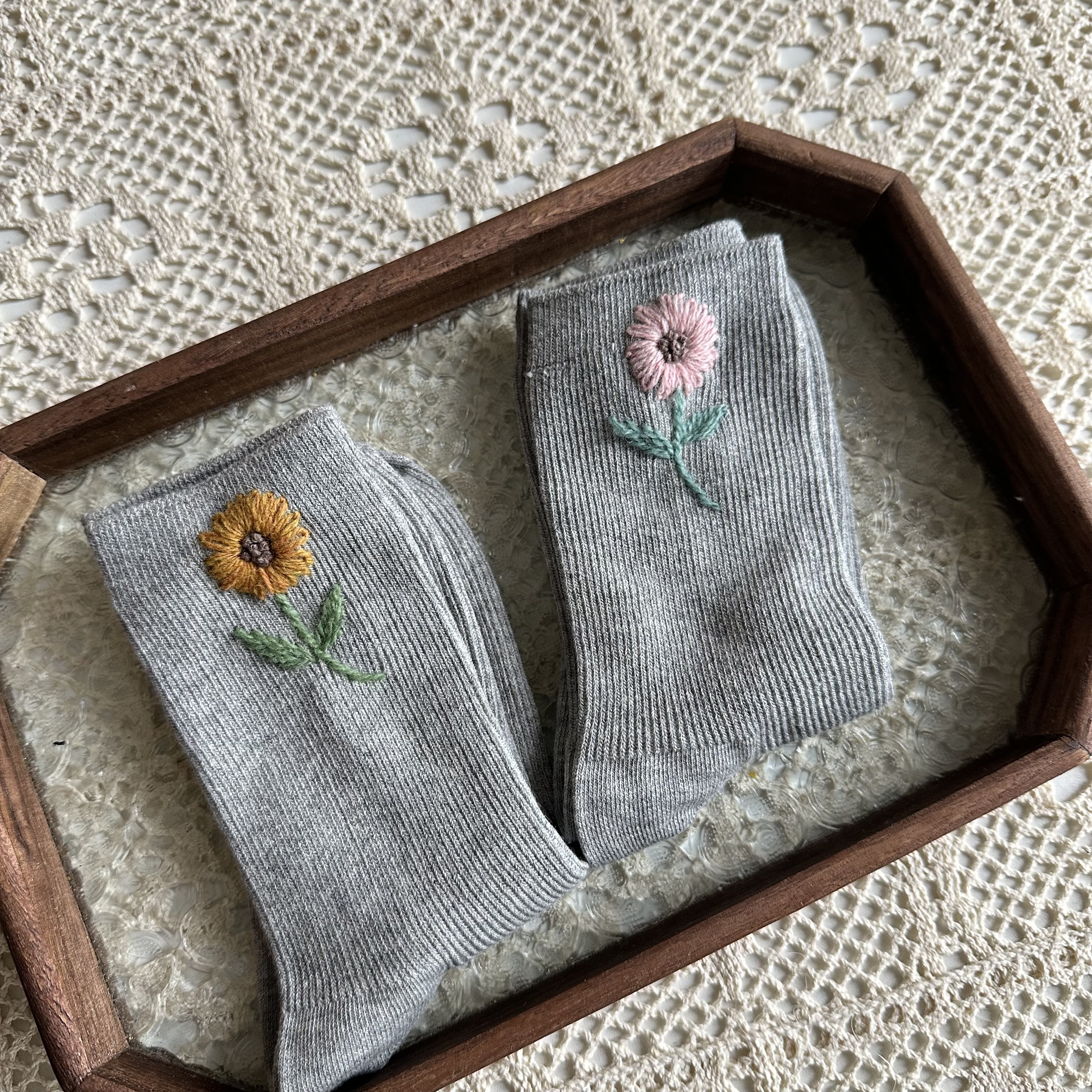 刺绣款女袜可爱风格保暖长袜松口纯棉袜子中筒袜纯手工毛线编织