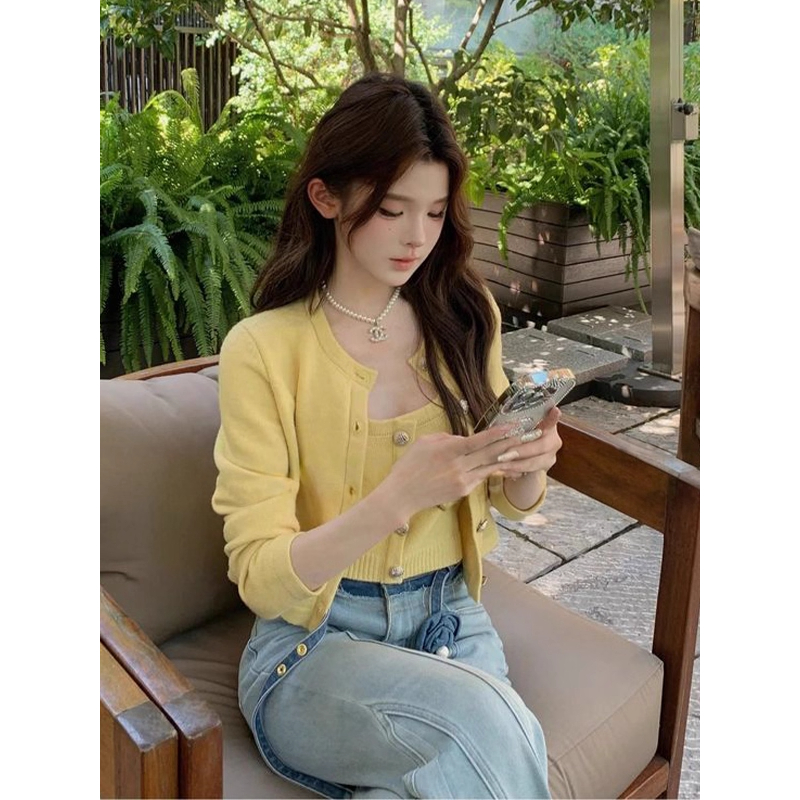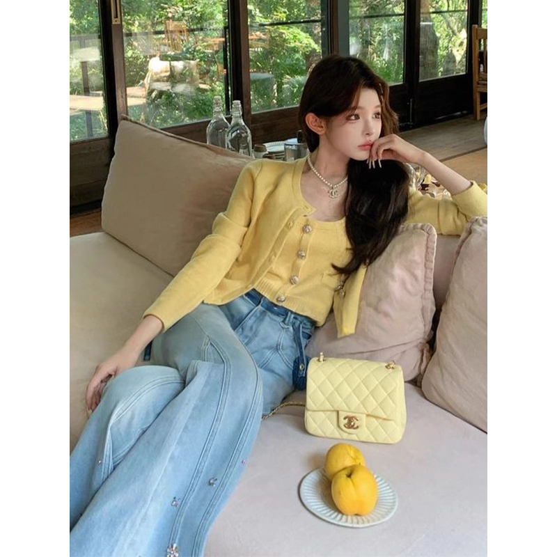 巨好看的韩系早秋穿搭一整套小香风黄色针织开衫吊带背心两件套装
