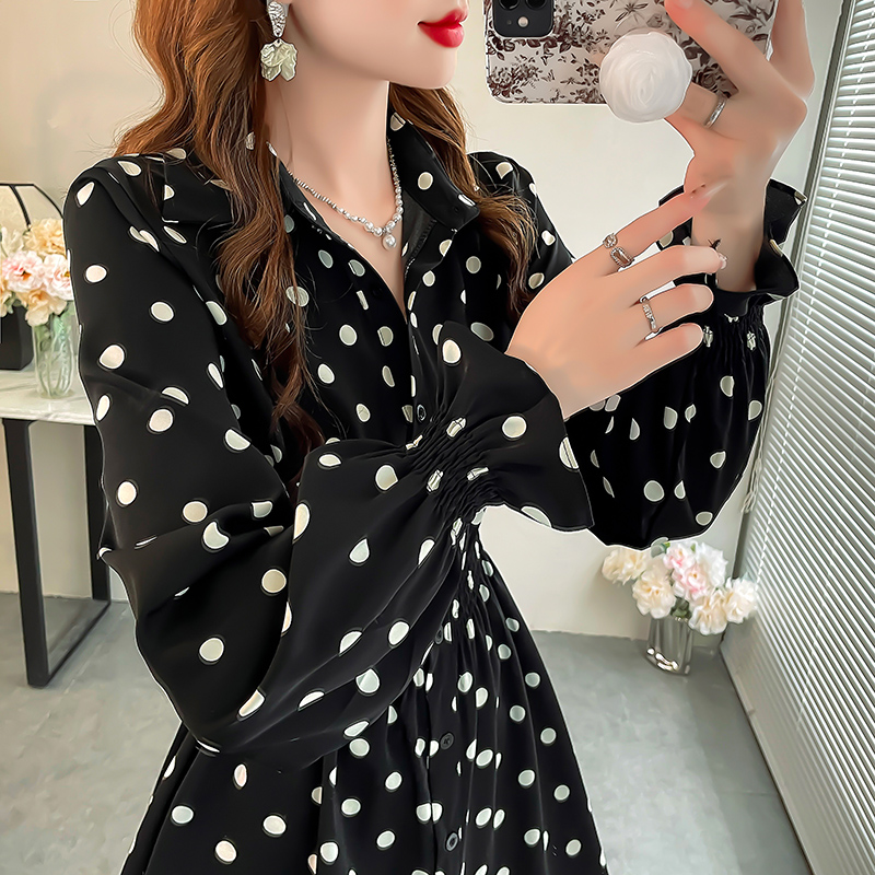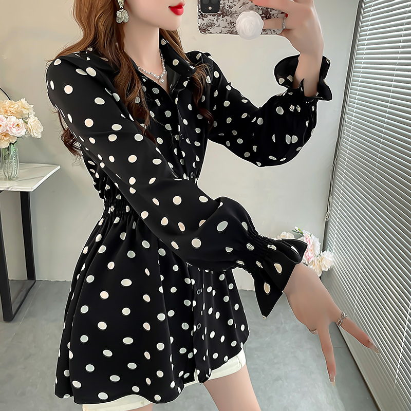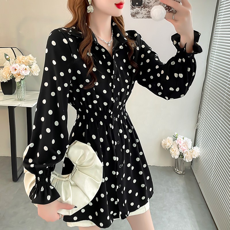 波点印花衬衫女赫本风法式小众上衣洋气显瘦收腰长袖中长款衬衣秋