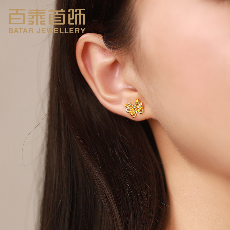 百泰首饰足金黄金耳钉镂空蝴蝶结