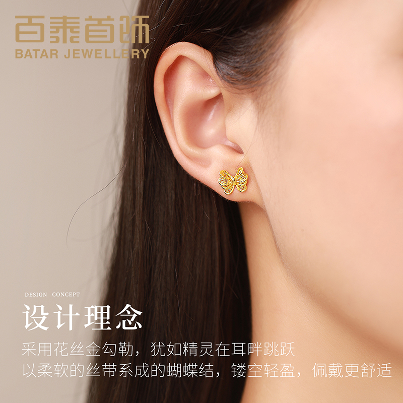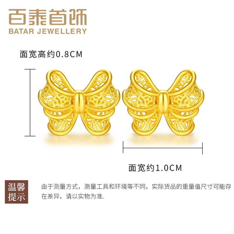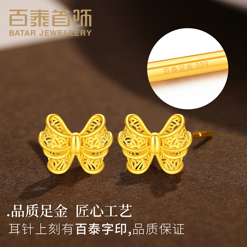 百泰首饰足金999黄金耳钉女镂空蝴蝶结耳饰耳坠时尚金耳丁女耳扣