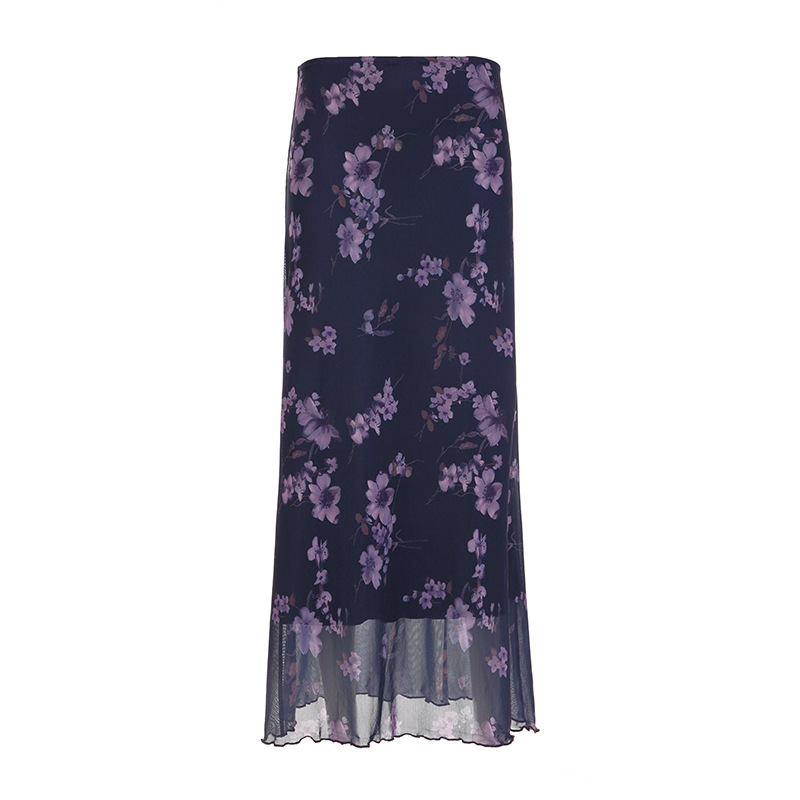 Dreamy 复古紫色植物印花网纱拼接显瘦长裙田园清新风修身半身裙