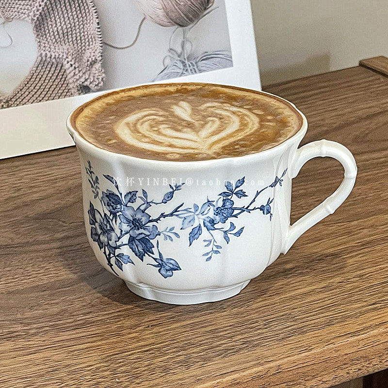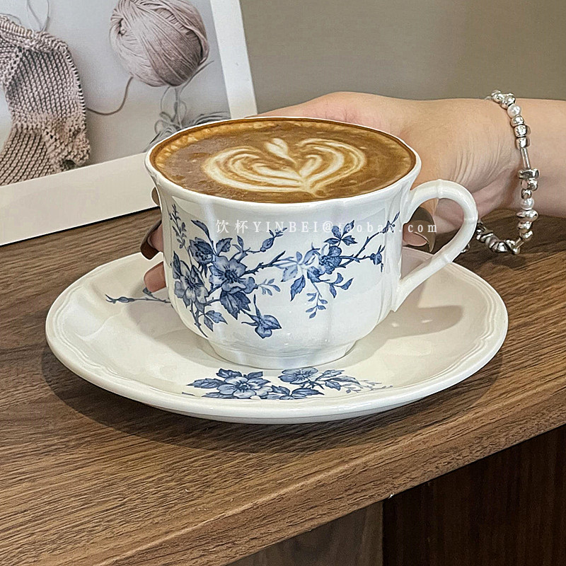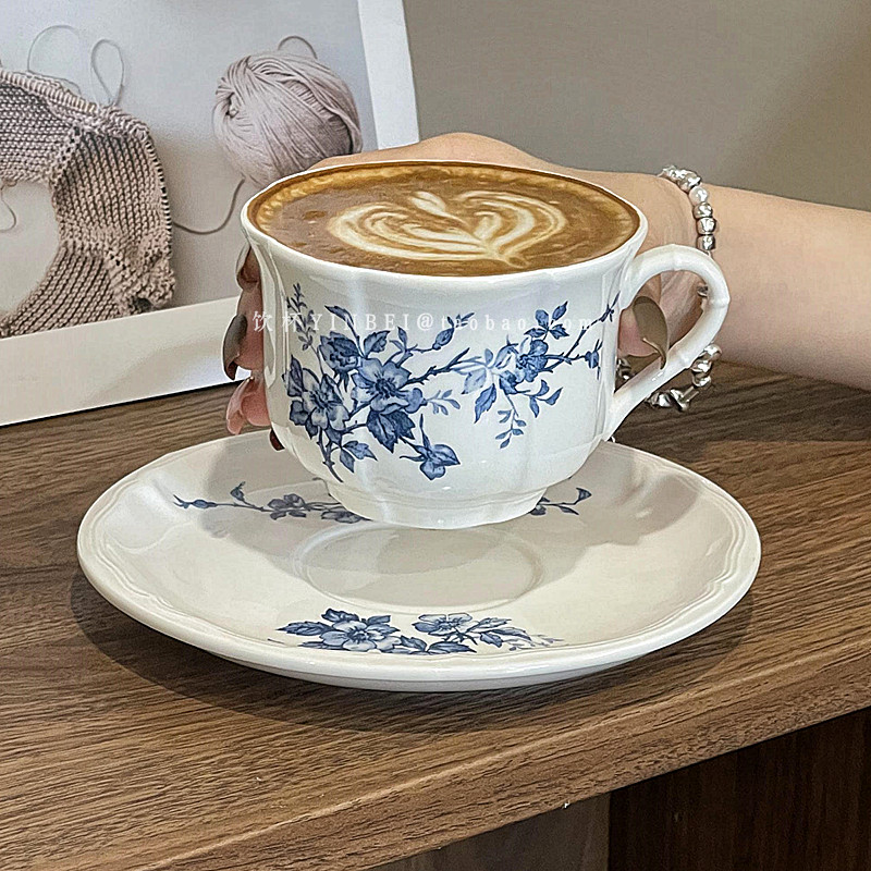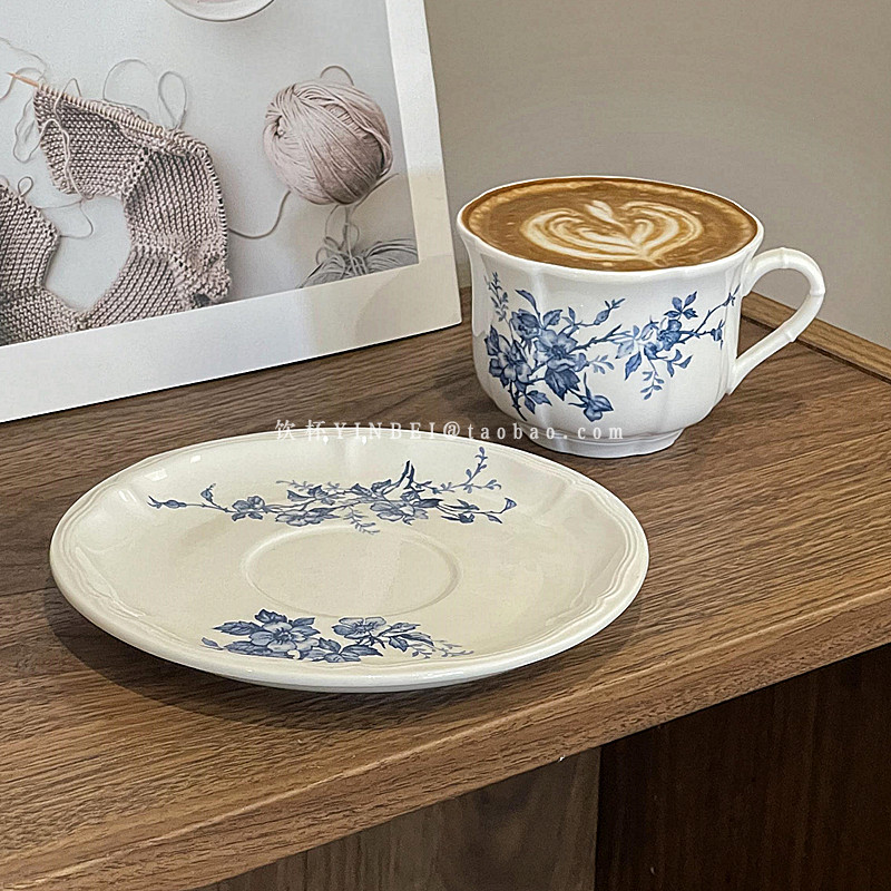 中古国风手绘青花咖啡杯碟古典下午茶拿铁杯复古拉花杯陶瓷马克杯