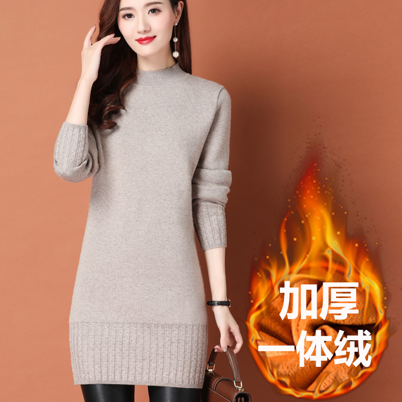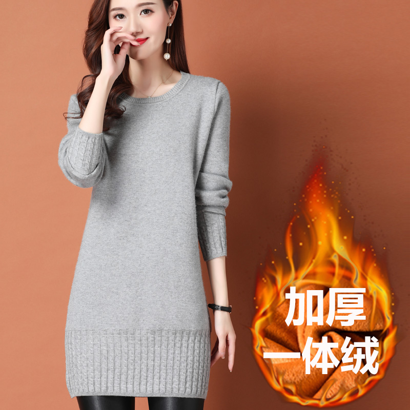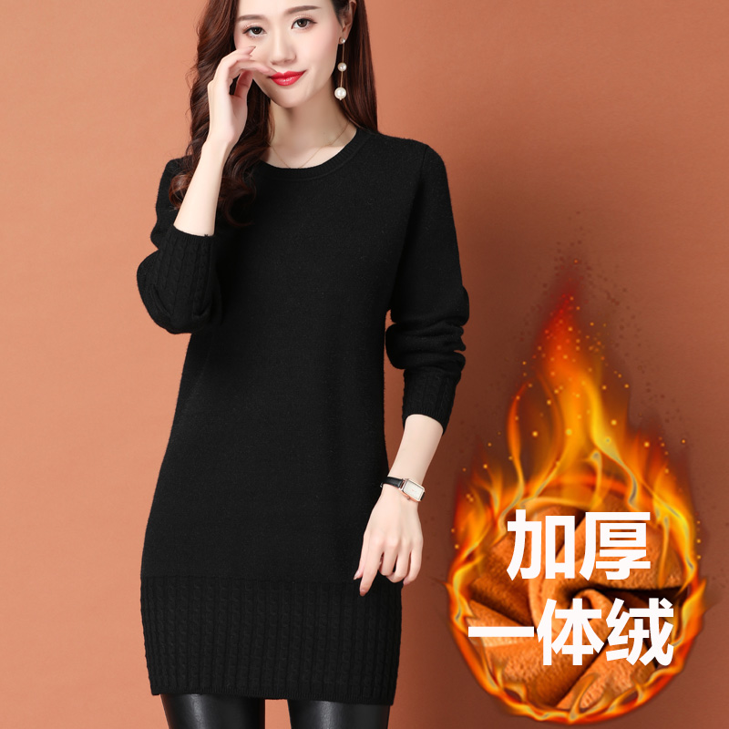 一体绒毛衣女中长款秋冬韩版加绒加厚大码宽松套头保暖针织打底衫