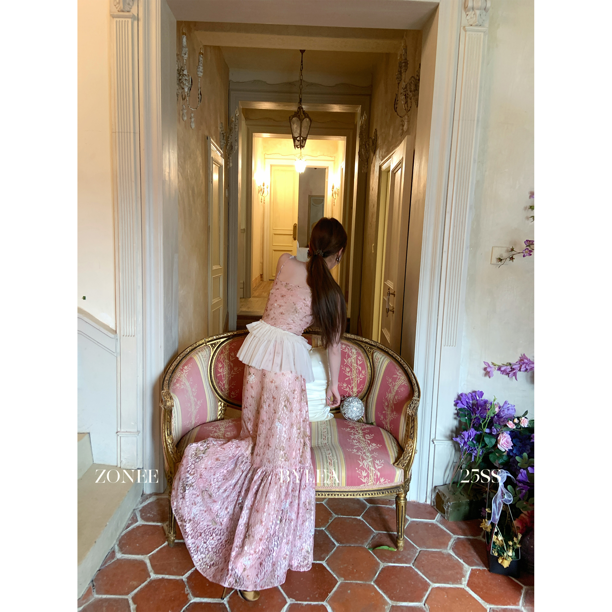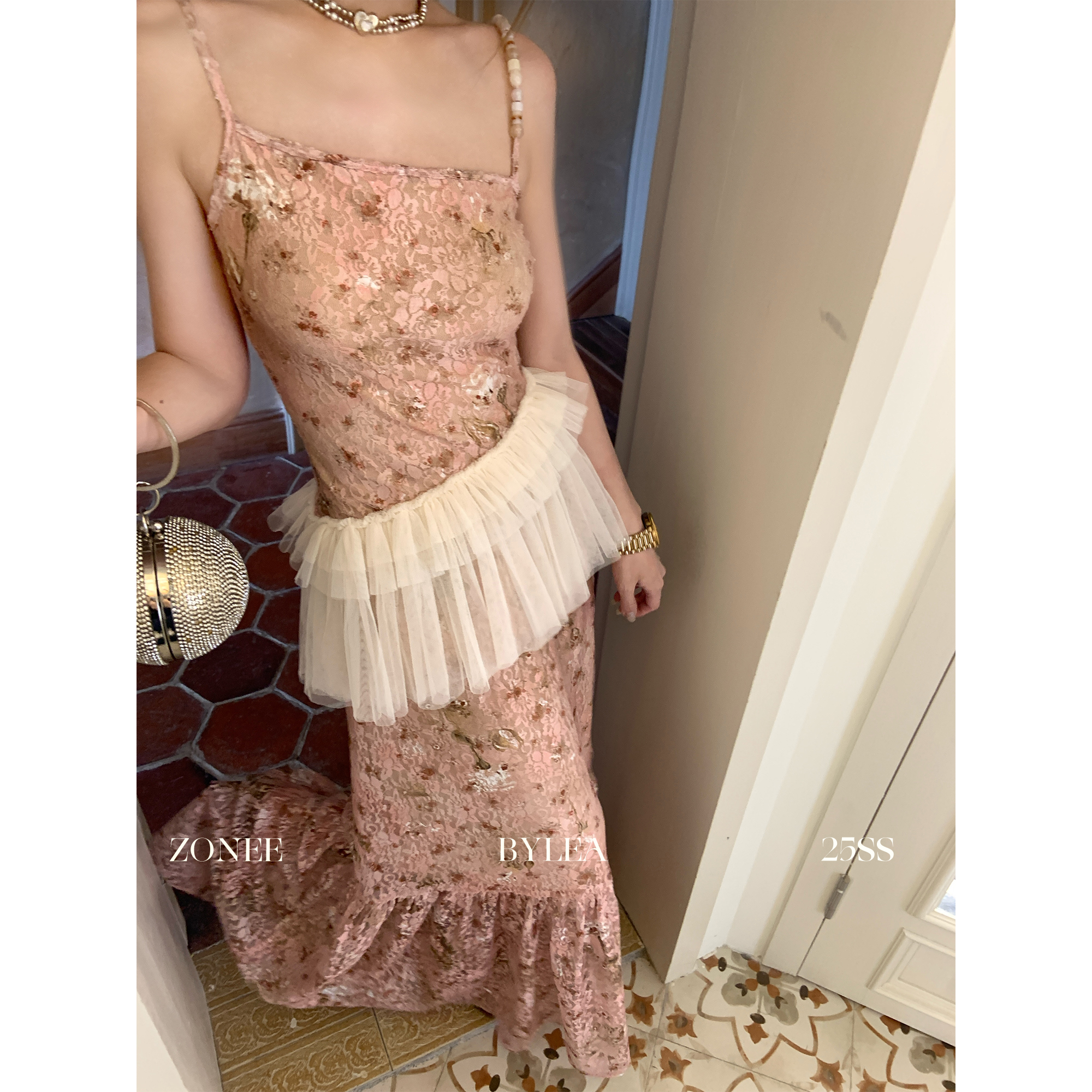 ZONEE/LEA宋亦雯 黛西之夜香槟肉粉蕾丝吊带上衣半身裙套装两件套