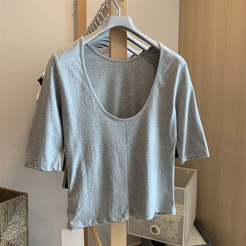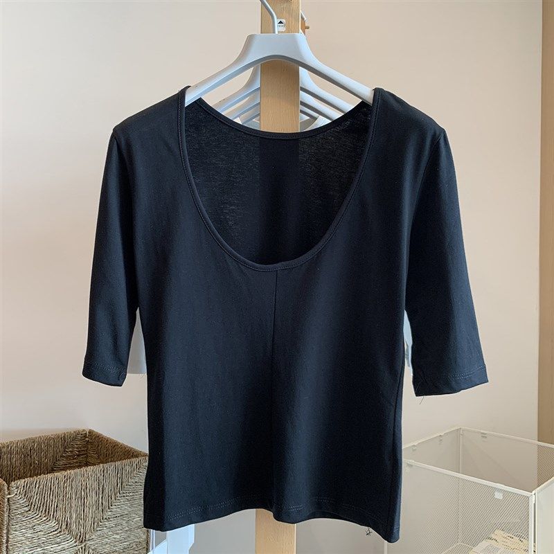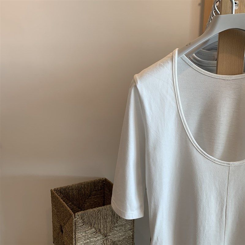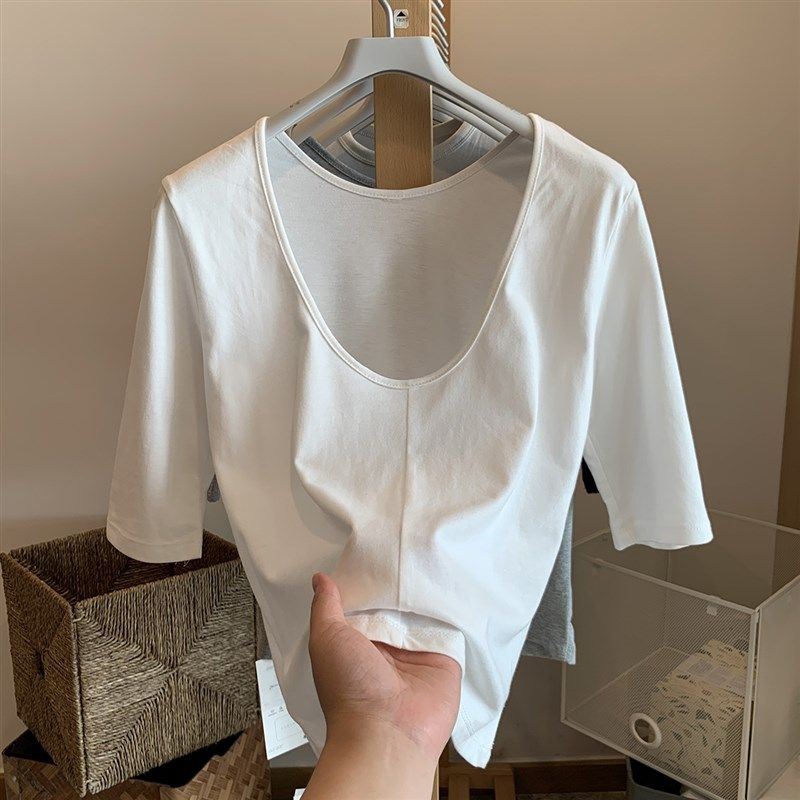 白色独特别致正肩大圆领五分袖t恤女小众漏锁骨正反两穿纯棉上衣