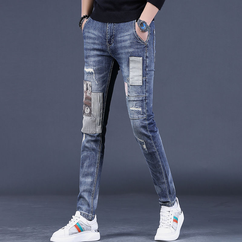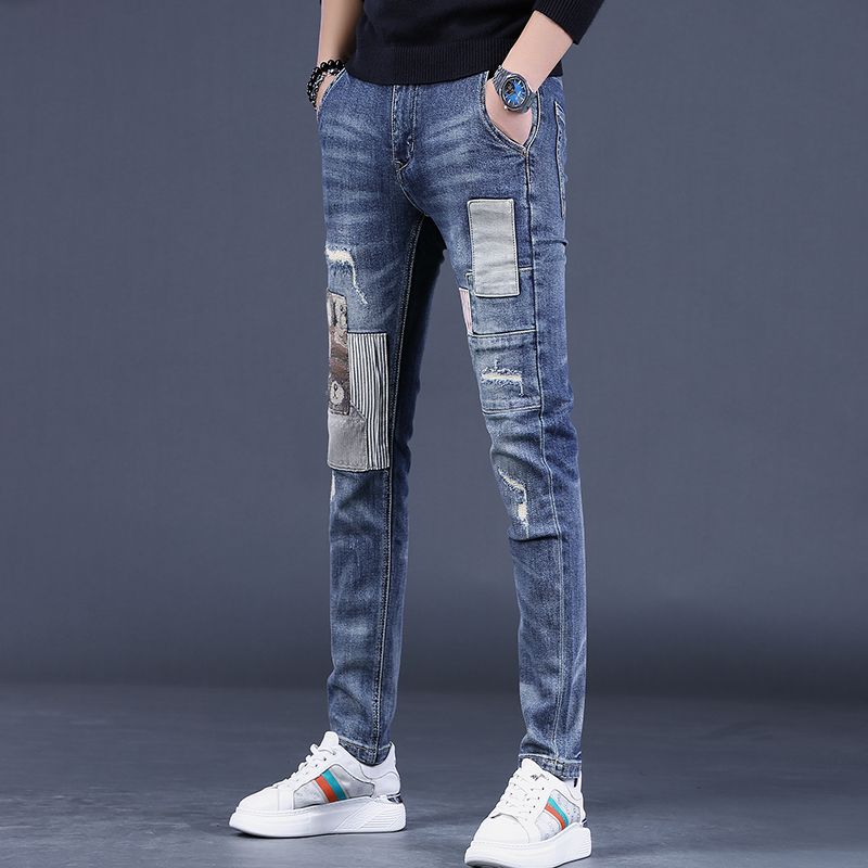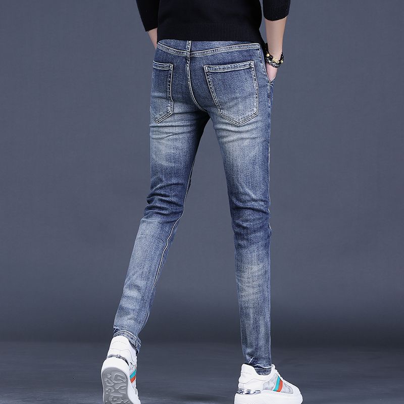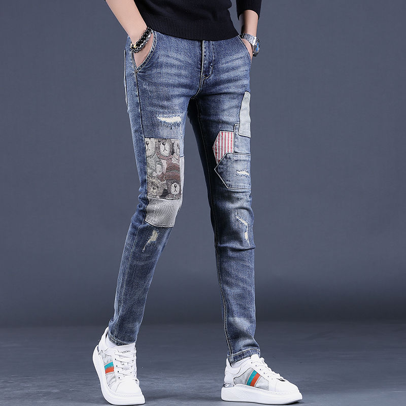 欧美潮牌秋季新款浅色印花男士牛仔裤时尚修身小脚裤潮流男裤子潮
