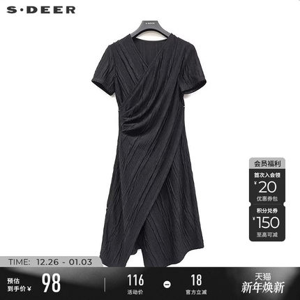 sdeer圣迪奥秋季女装时尚V领肌理褶皱不规则短袖连衣裙S223Z12S6