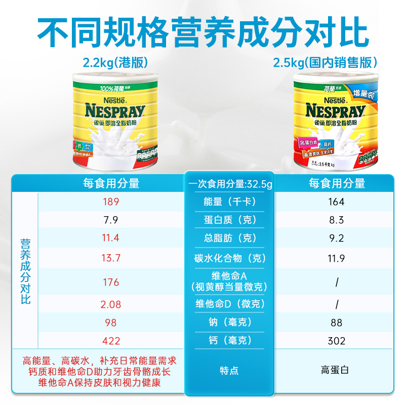 Nestle雀巢即溶全脂奶粉高蛋白高钙全家营养牛奶粉港版进口2200g
