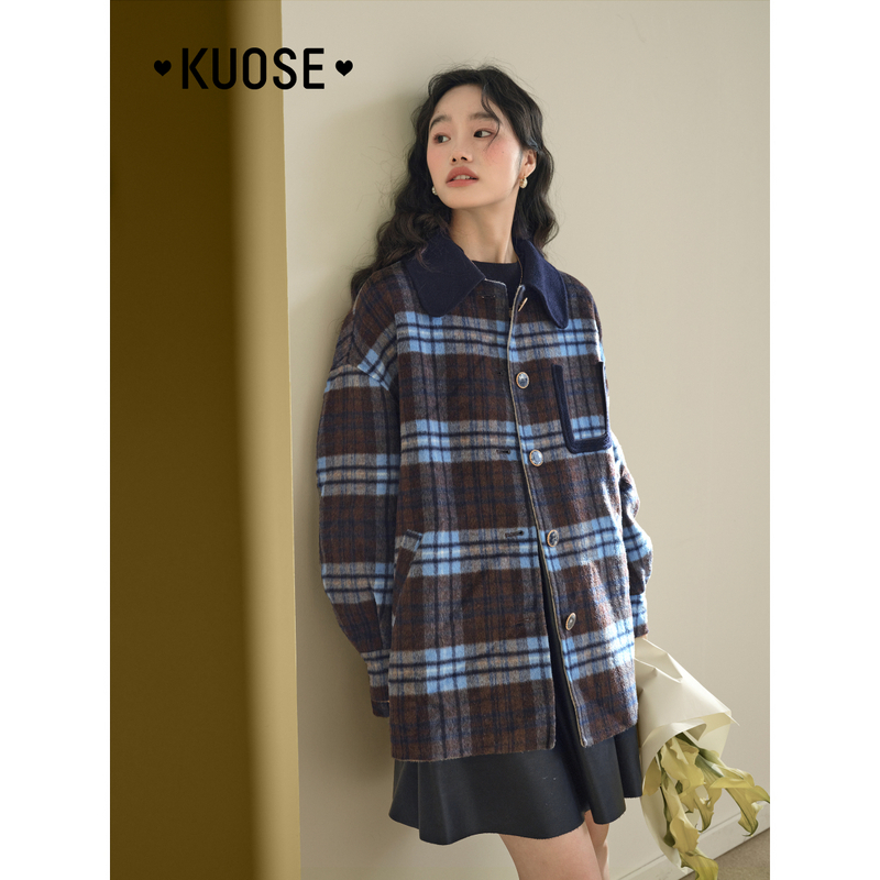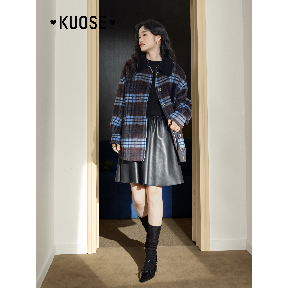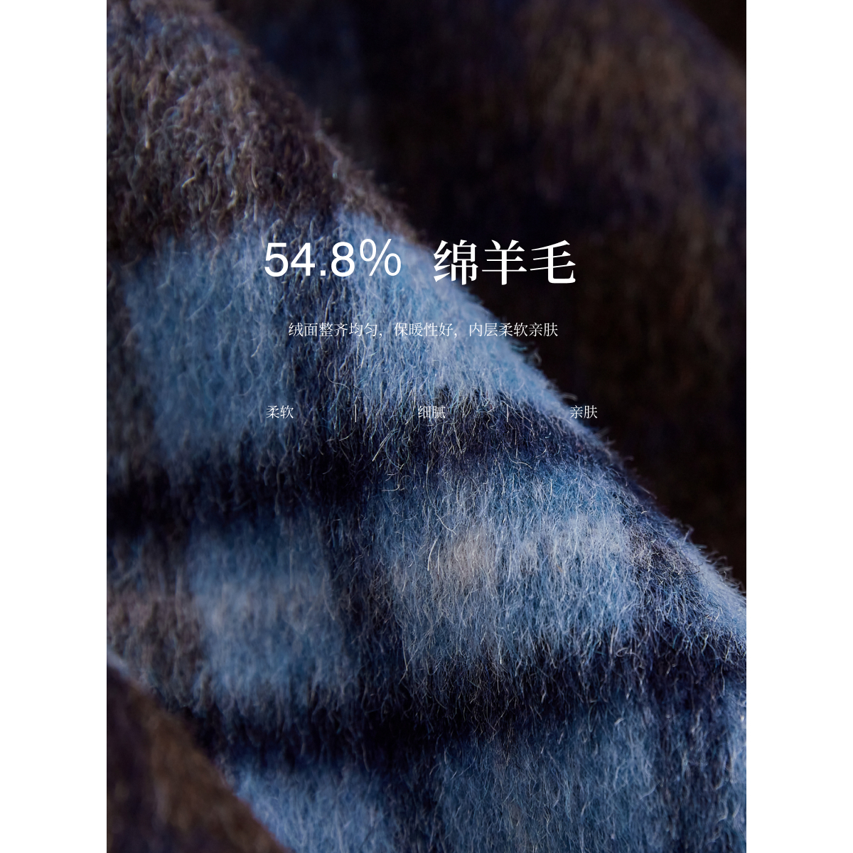 阔色蓝灰色格子双面毛呢外套中长款女2024秋冬季新款翻领呢子大衣