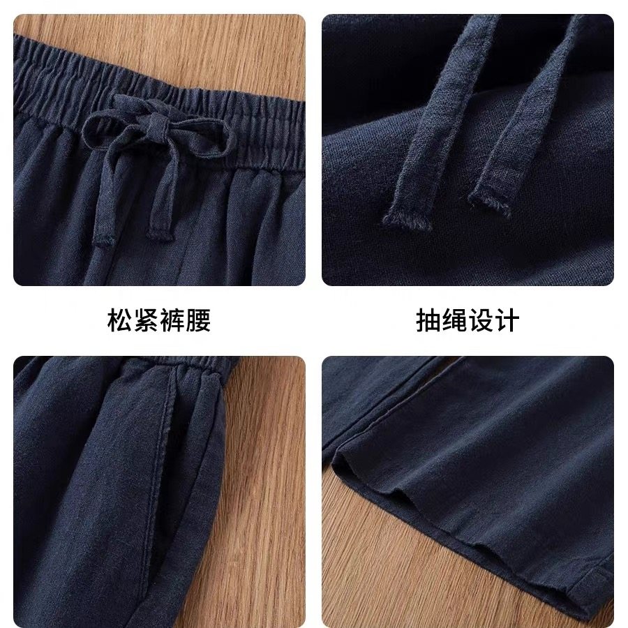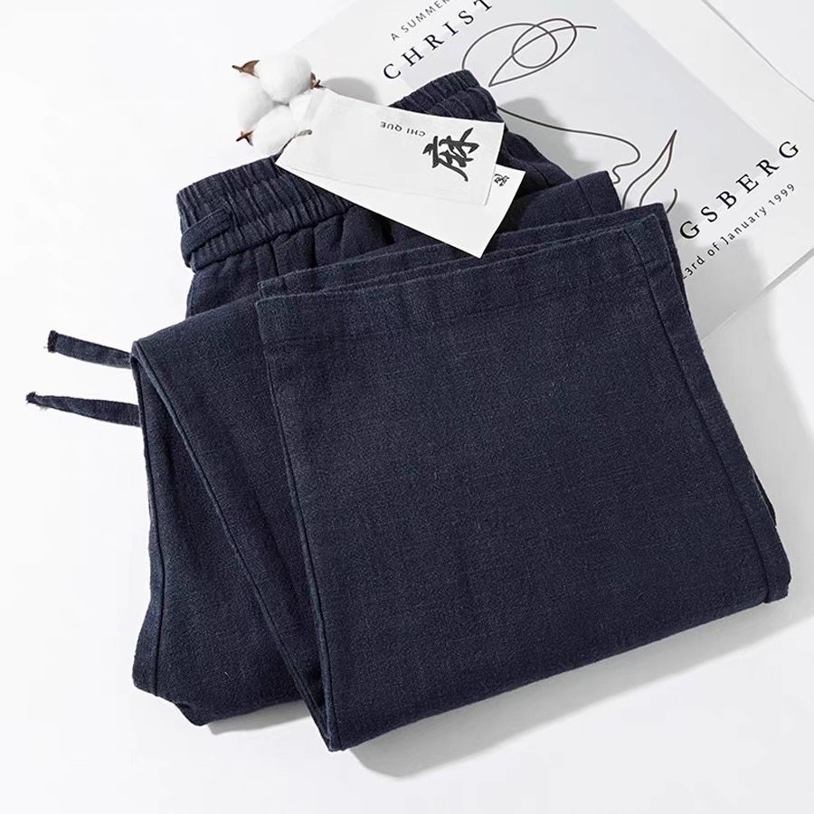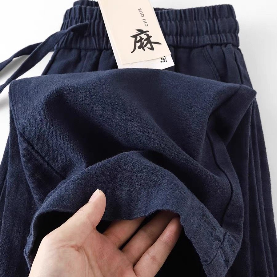 藏蓝色棉麻裤男直筒休闲裤新款宽松薄款显瘦阔腿裤女夏季裤子