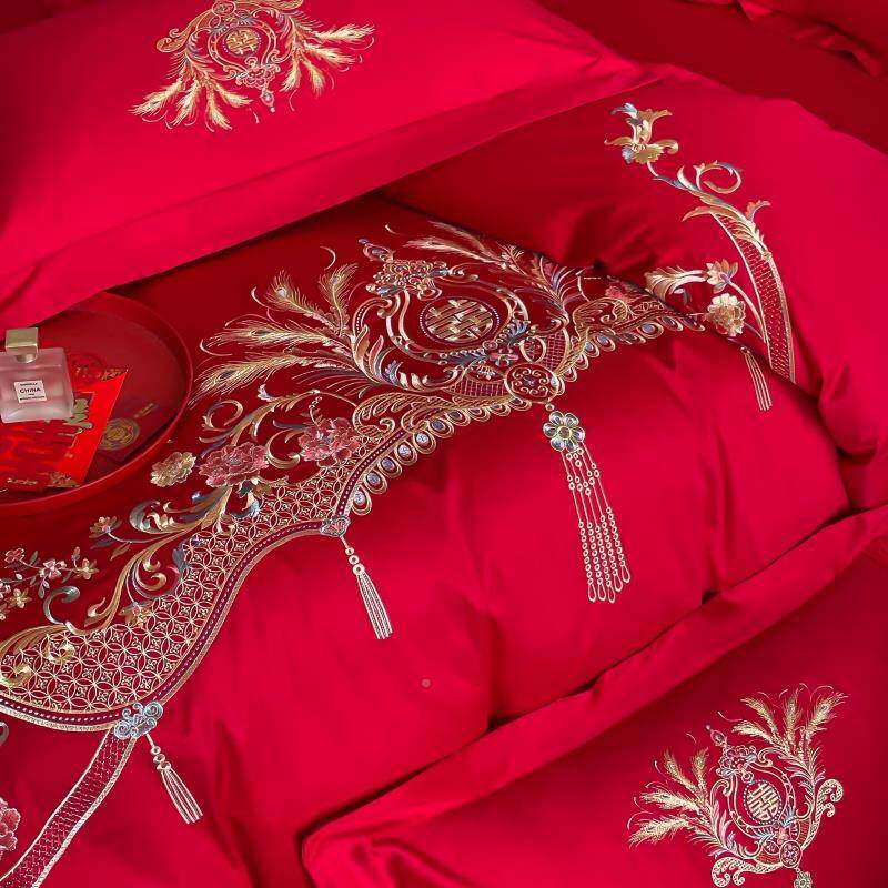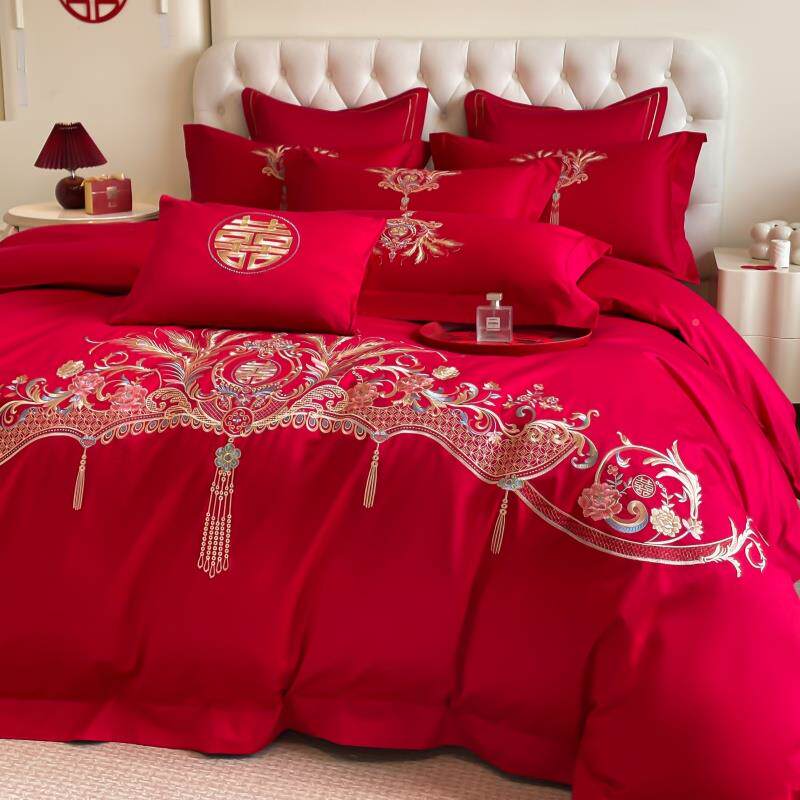 套中式结四嫁件大红色陪床单被套纯F78S76SJ棉婚庆床上用品婚婚房