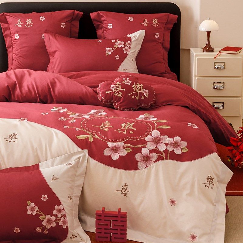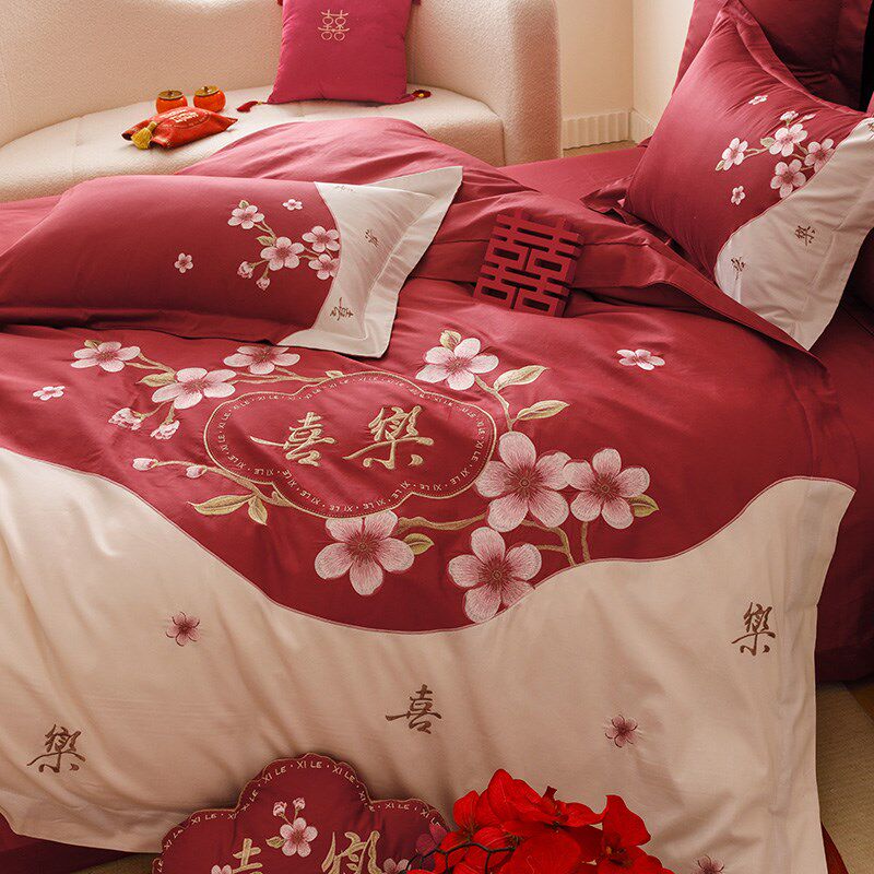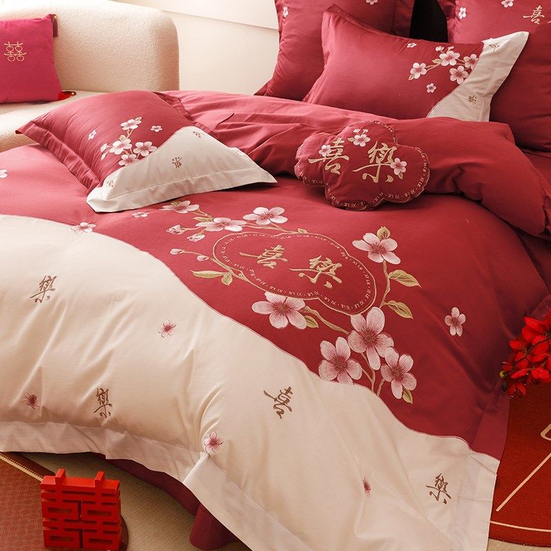 小浪漫高支全棉结婚四件套花卉刺绣喜嫁被套床单红色床上用品