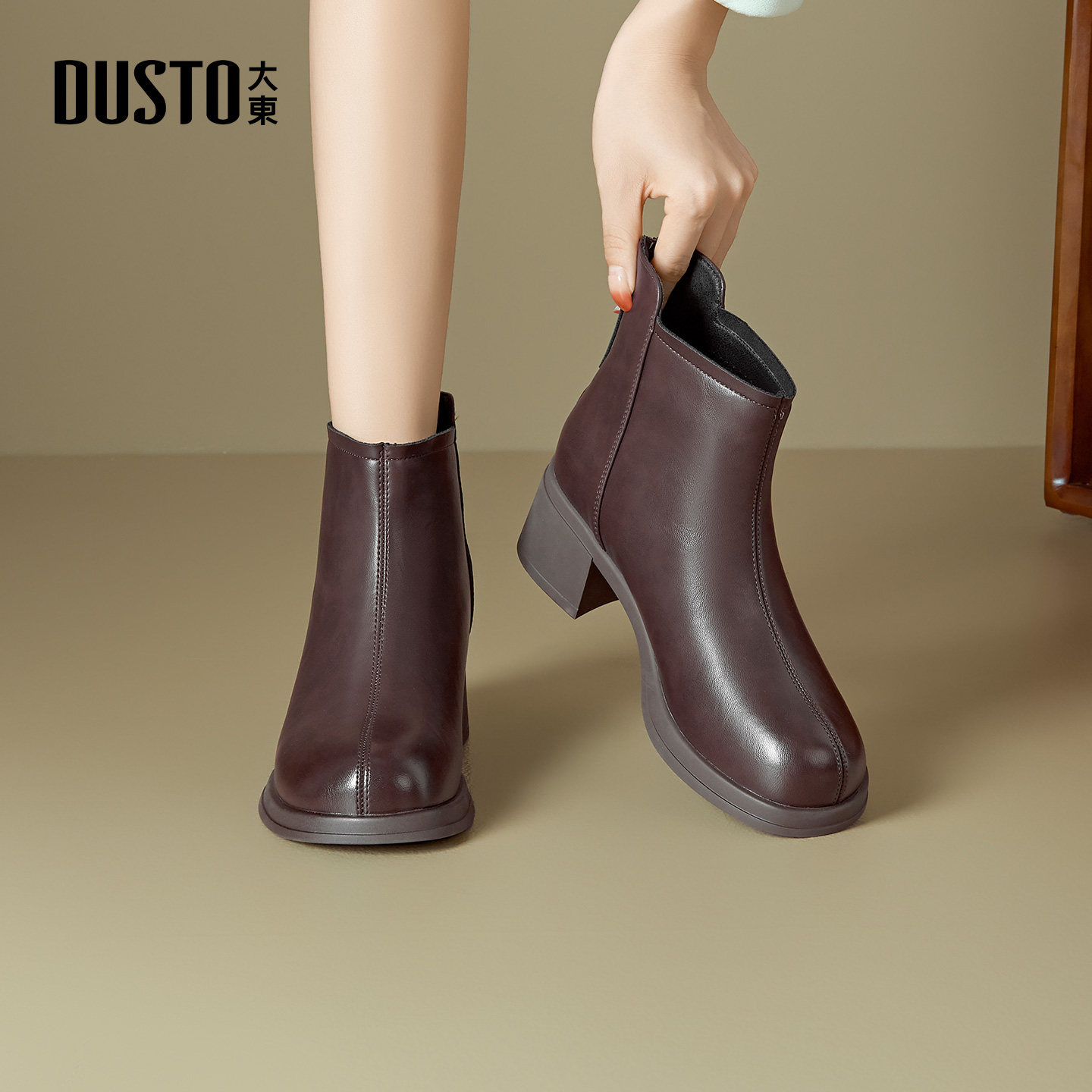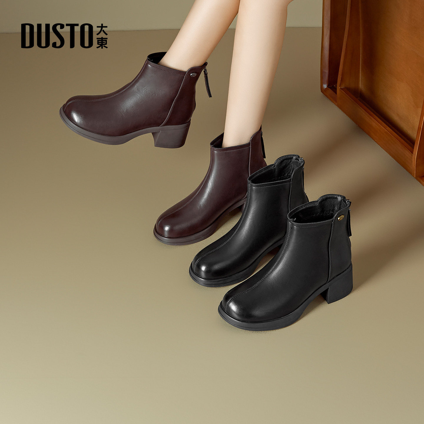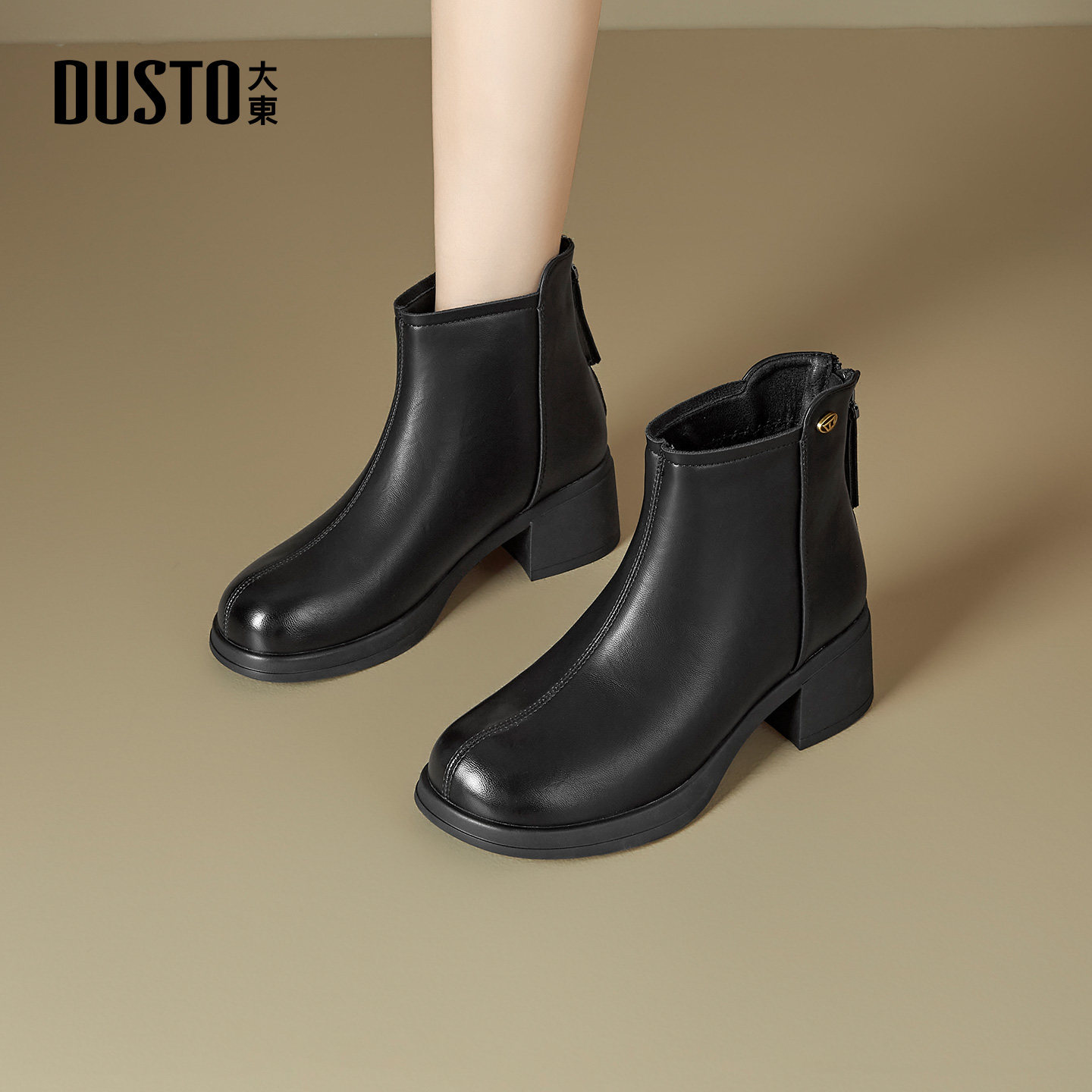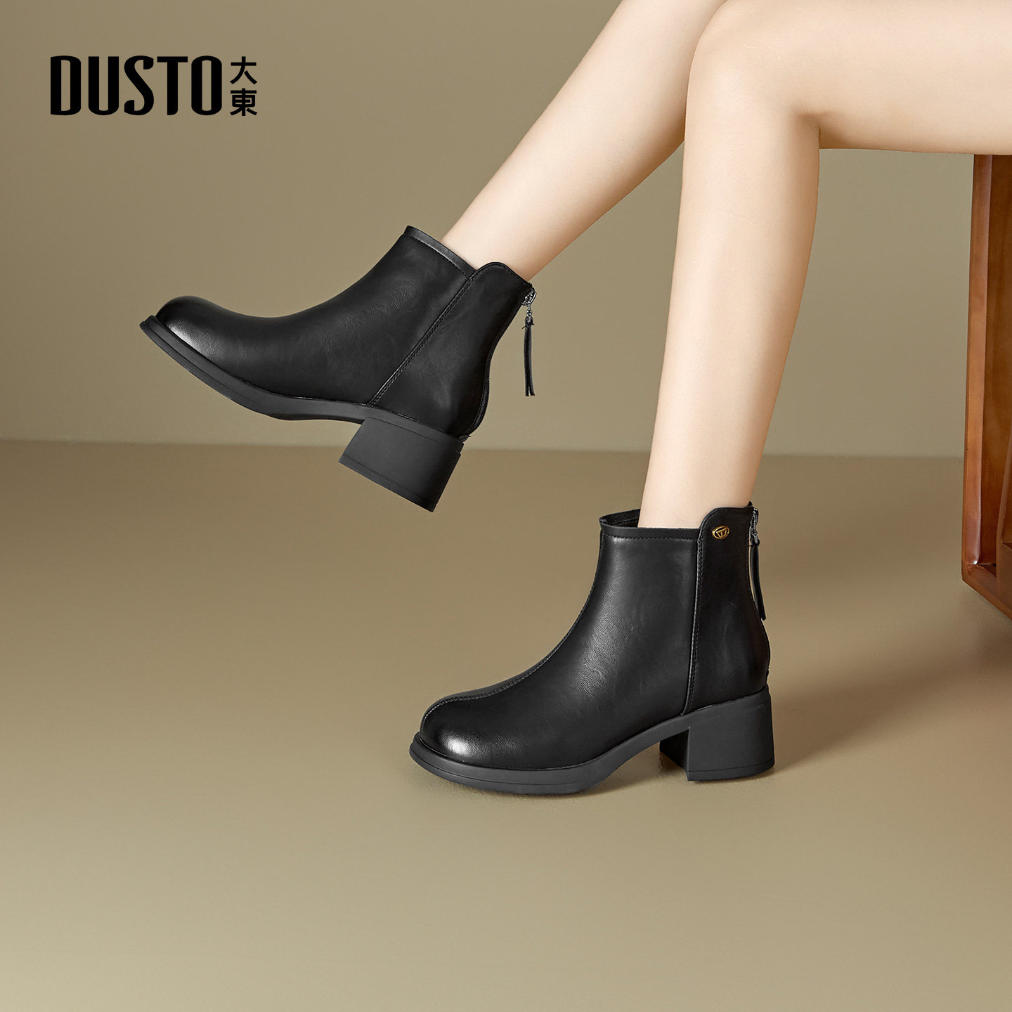 大东时装靴女鞋2025冬季新款简约圆头高跟靴后拉链黑色女士短筒靴