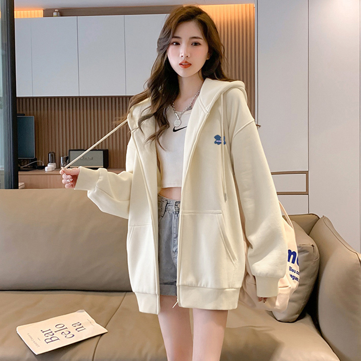 唐狮秋冬季新款女连帽外套爆款奶白色卫衣开衫休闲风慵懒感宽松tu