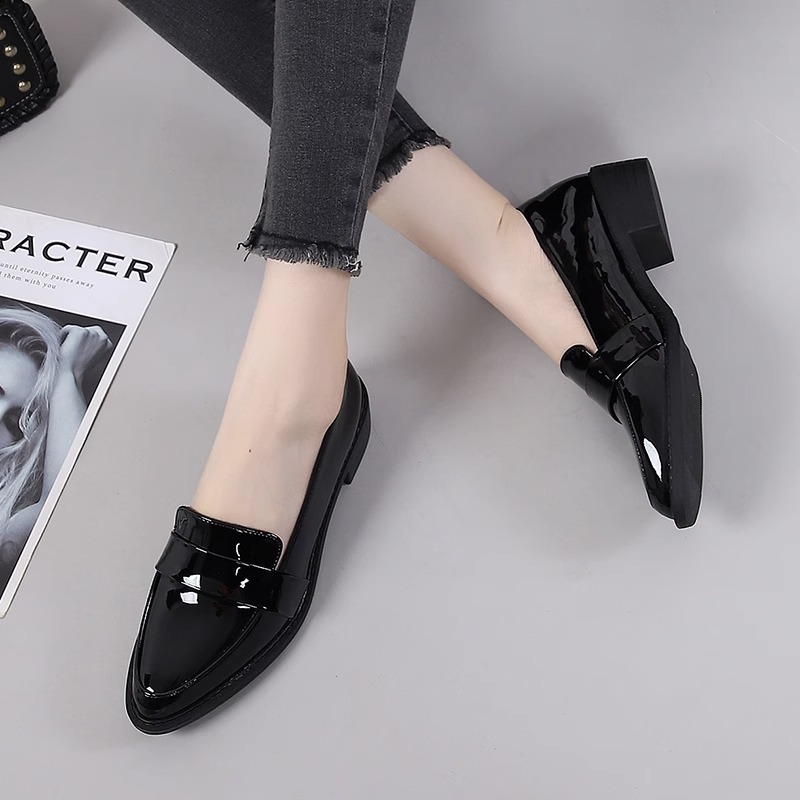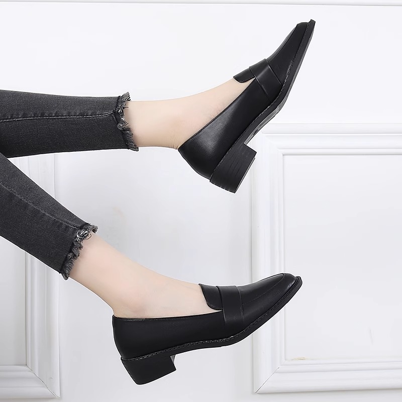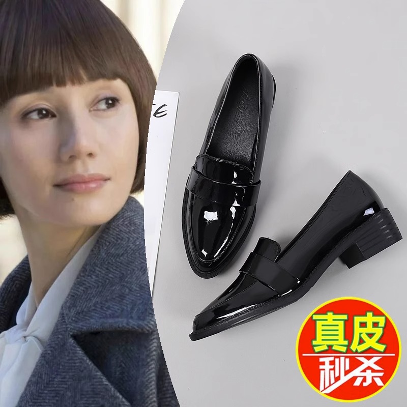 真皮尖头乐福鞋女2024年春秋季新款英伦风平底粗跟时尚百搭小皮鞋