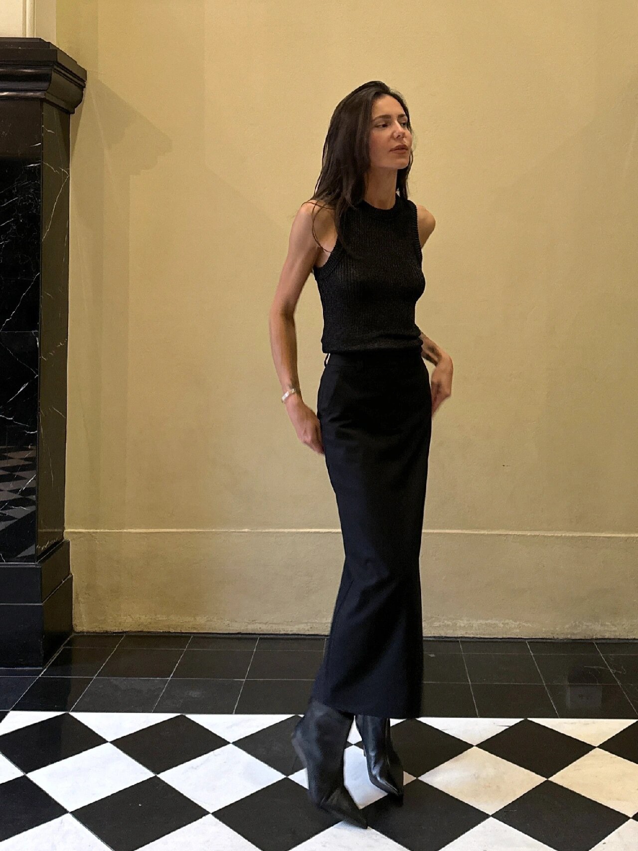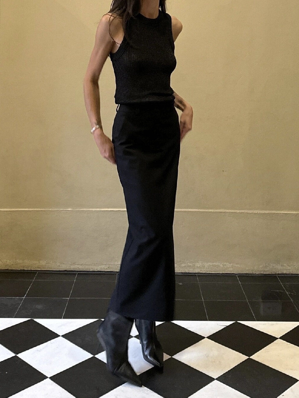 25新pepamack同款 黑色立体针织背心上 黑色显瘦直筒西装半身长裙