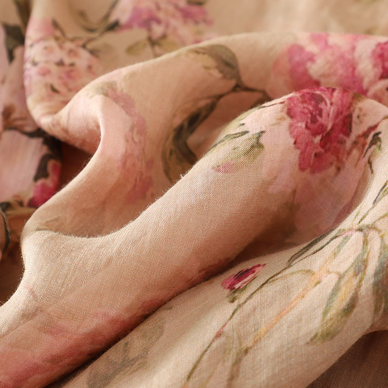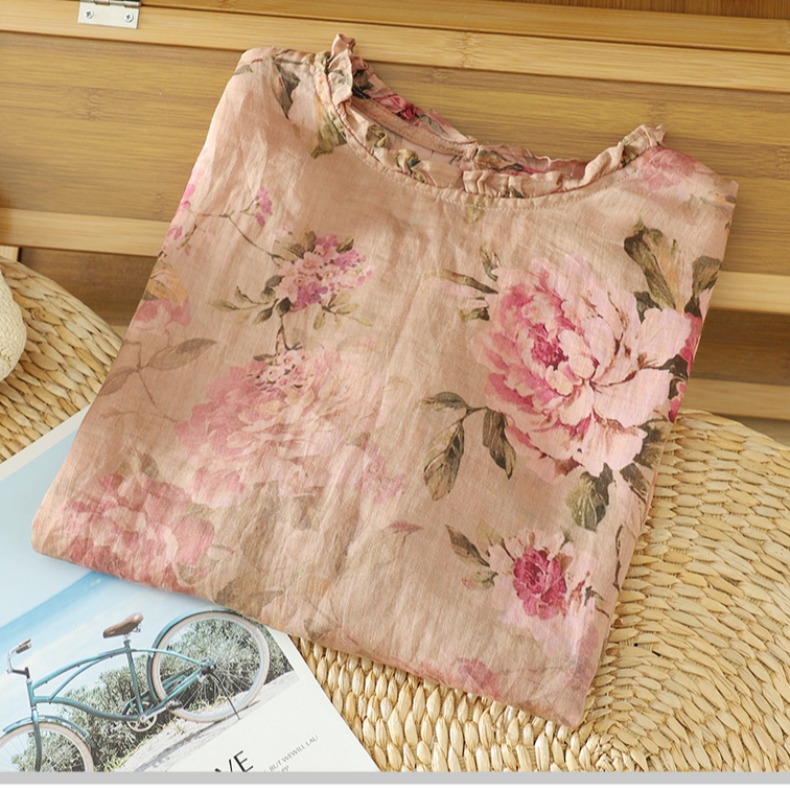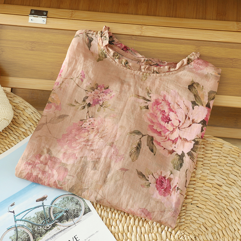 夏季新款复古文艺衬衫女宽松显瘦苎麻印花荷叶花边短袖上衣薄款