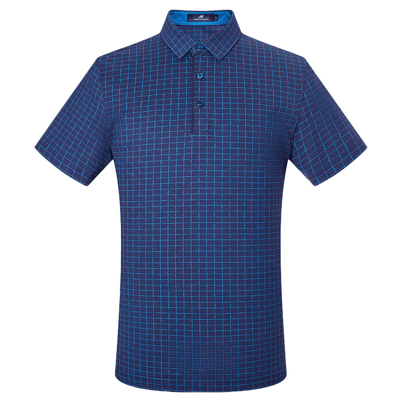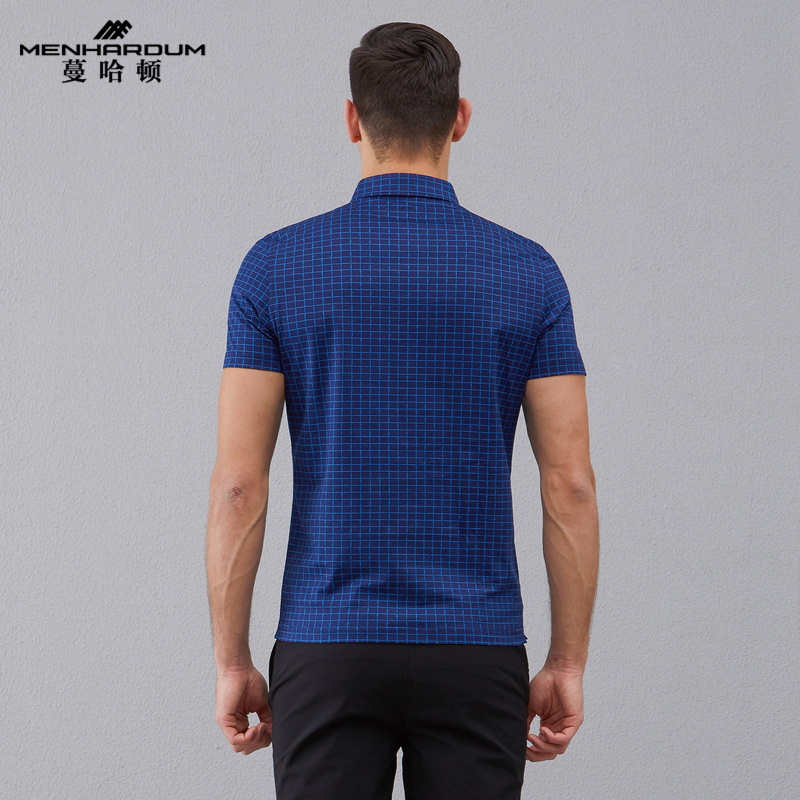 蔓哈顿夏季新款桑蚕丝混纺T恤男开衫翻领短袖中年格子Polo衫