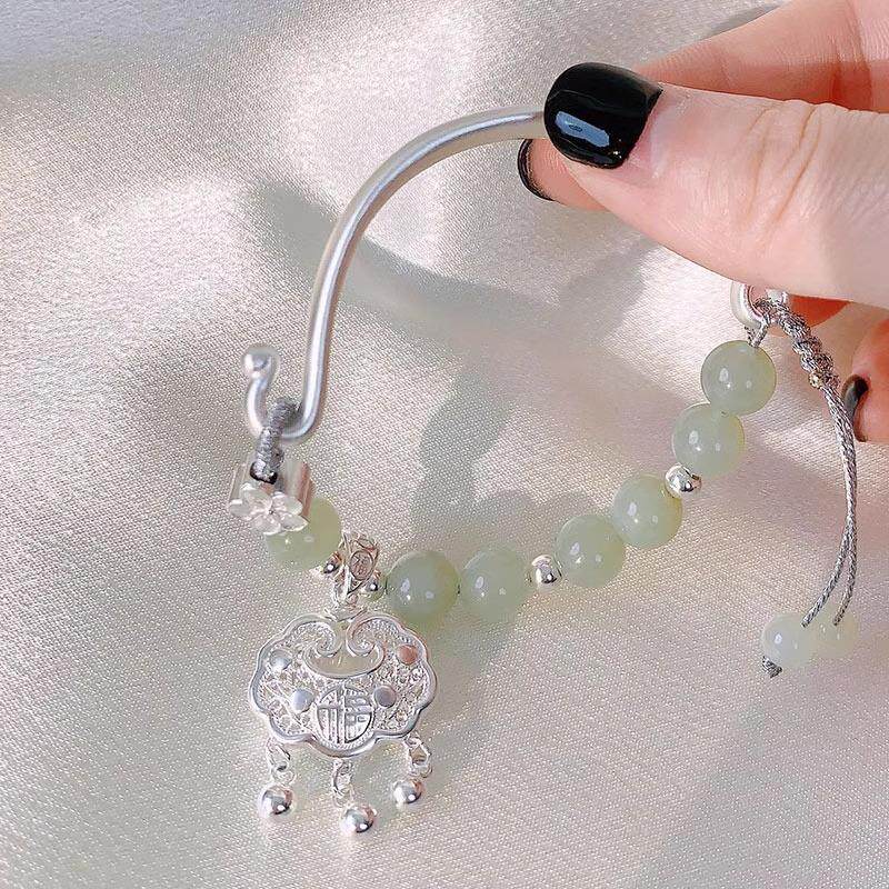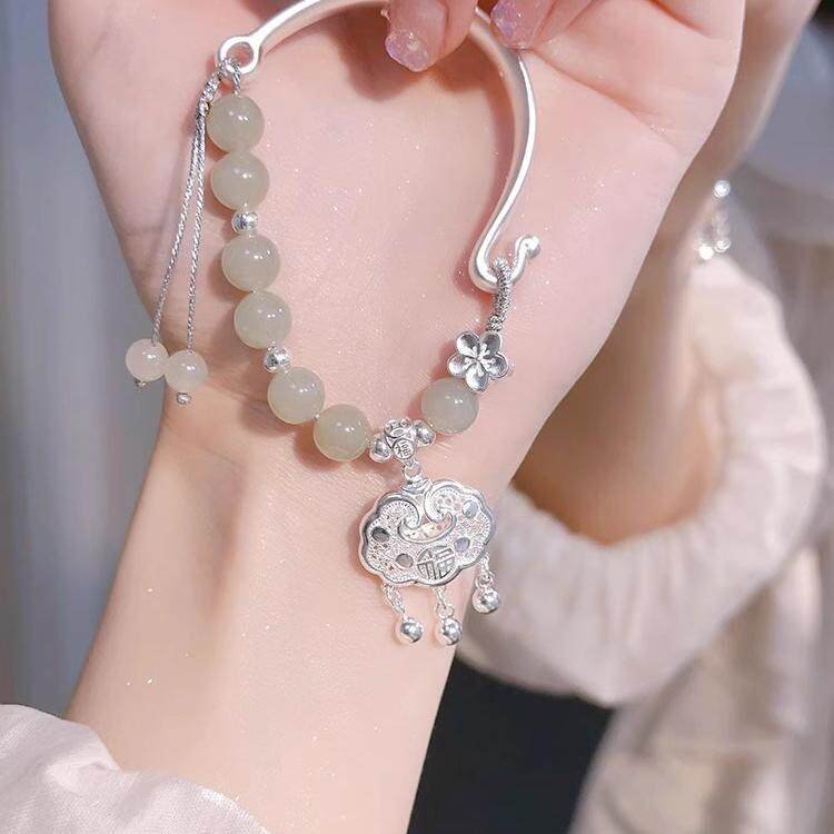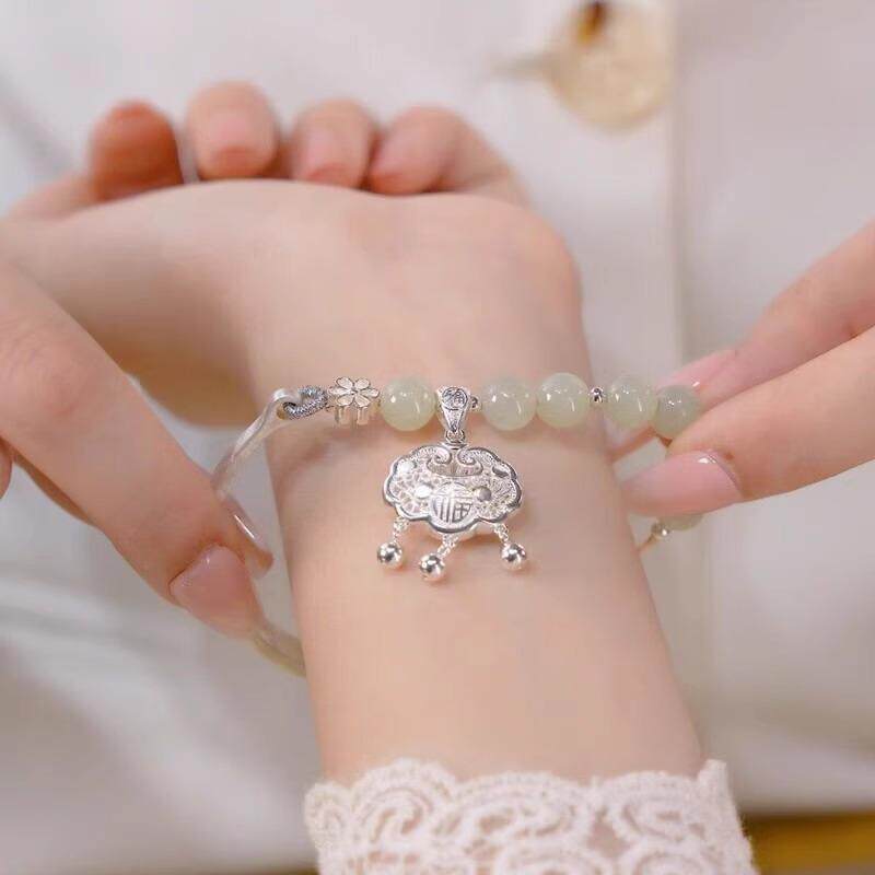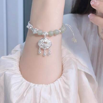 925纯银和田玉平安锁半镯手链女款高级感轻奢小众长命锁珠子手串
