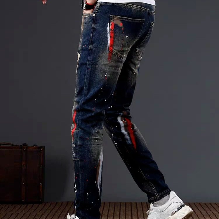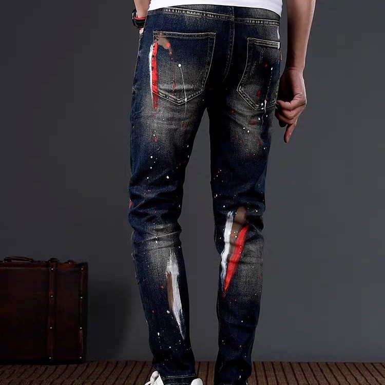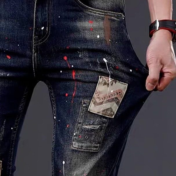 2025新款时尚小众设计感牛仔裤男破洞泼墨油漆潮牌修身小脚裤子男