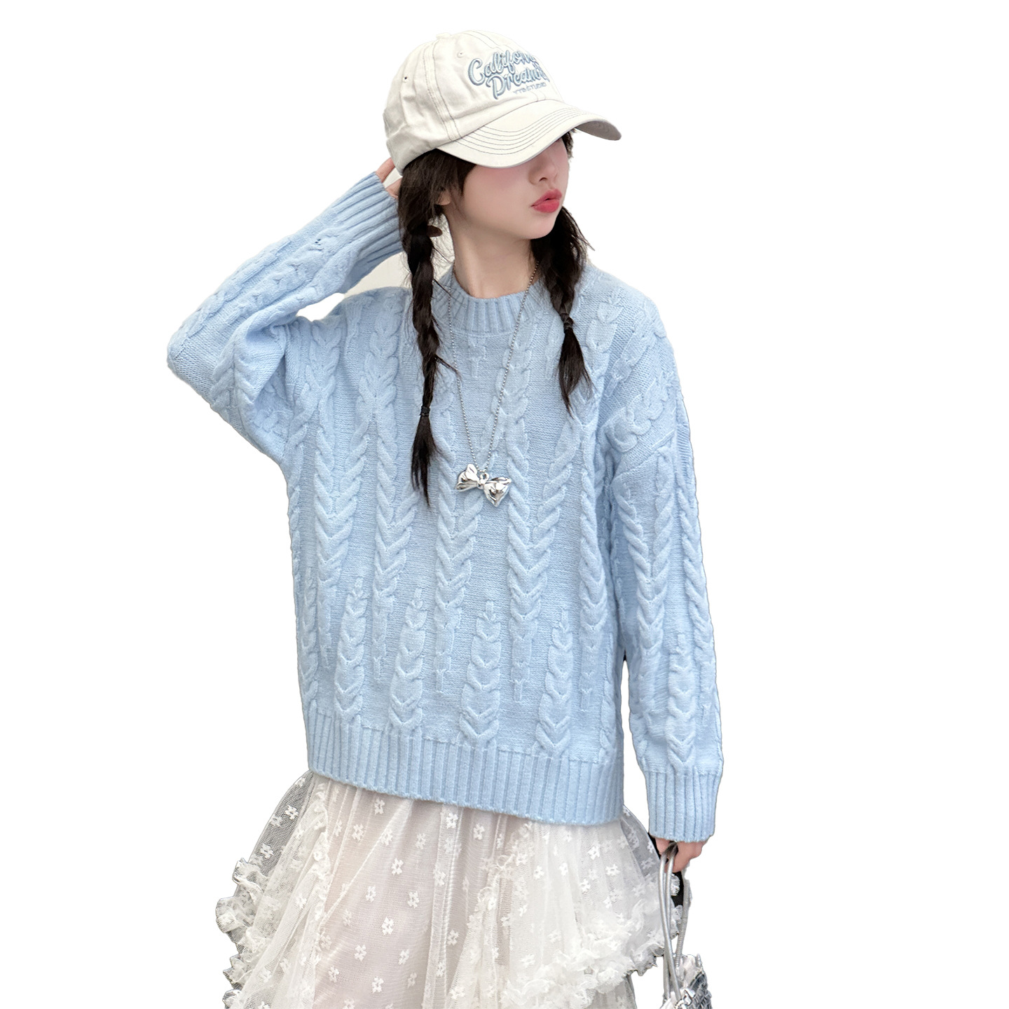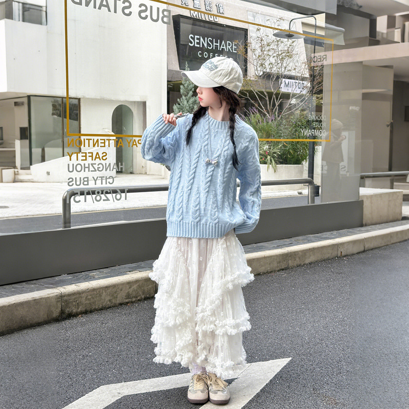 女童毛衣秋冬新款蓝色圆领纯色百搭打底针织衫毛线衣中大儿童