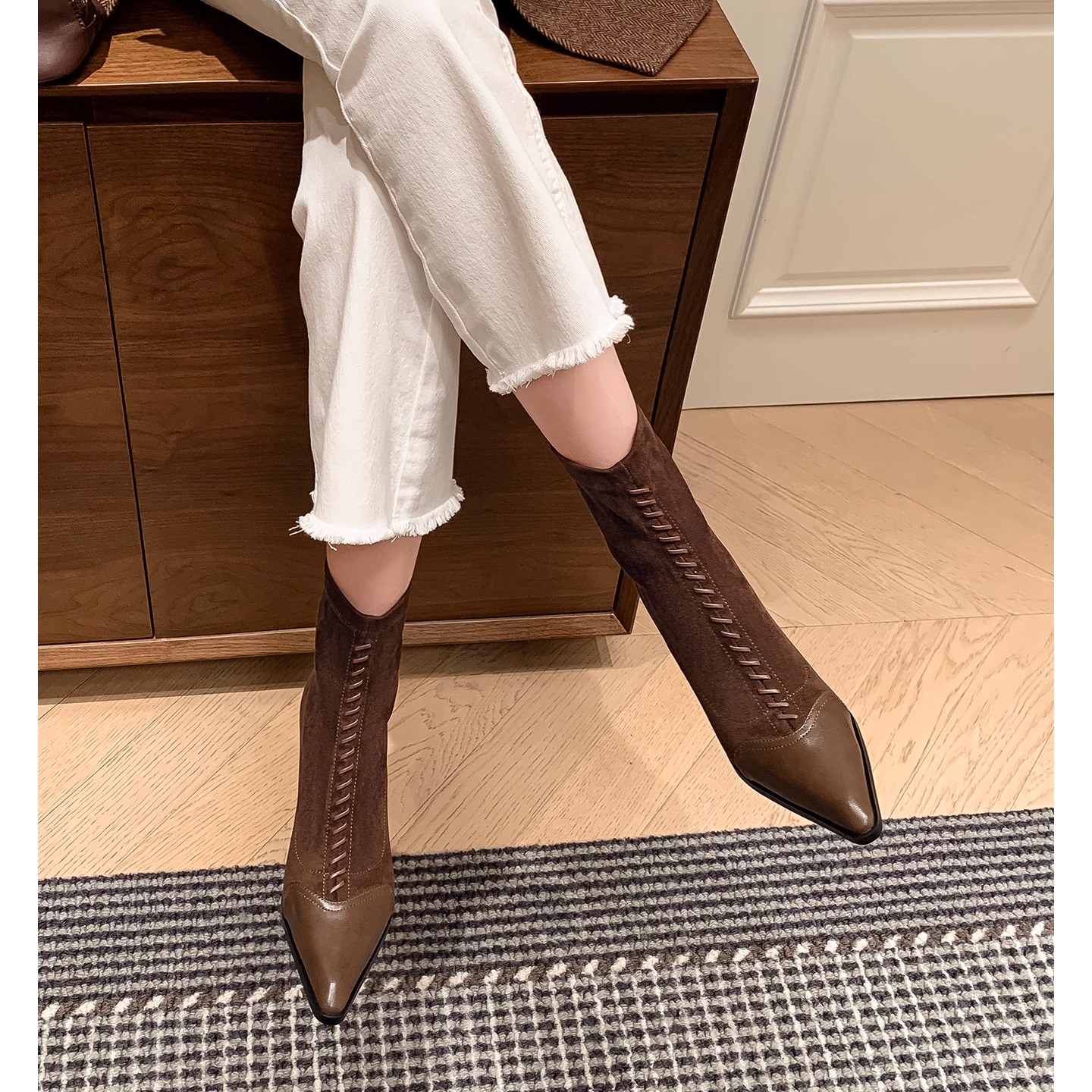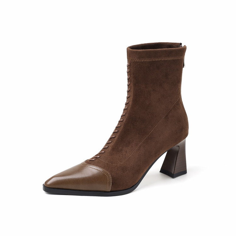 设计感时尚~7cm粗跟尖头小个子弹力靴女短靴气质显瘦高跟裸靴灰色